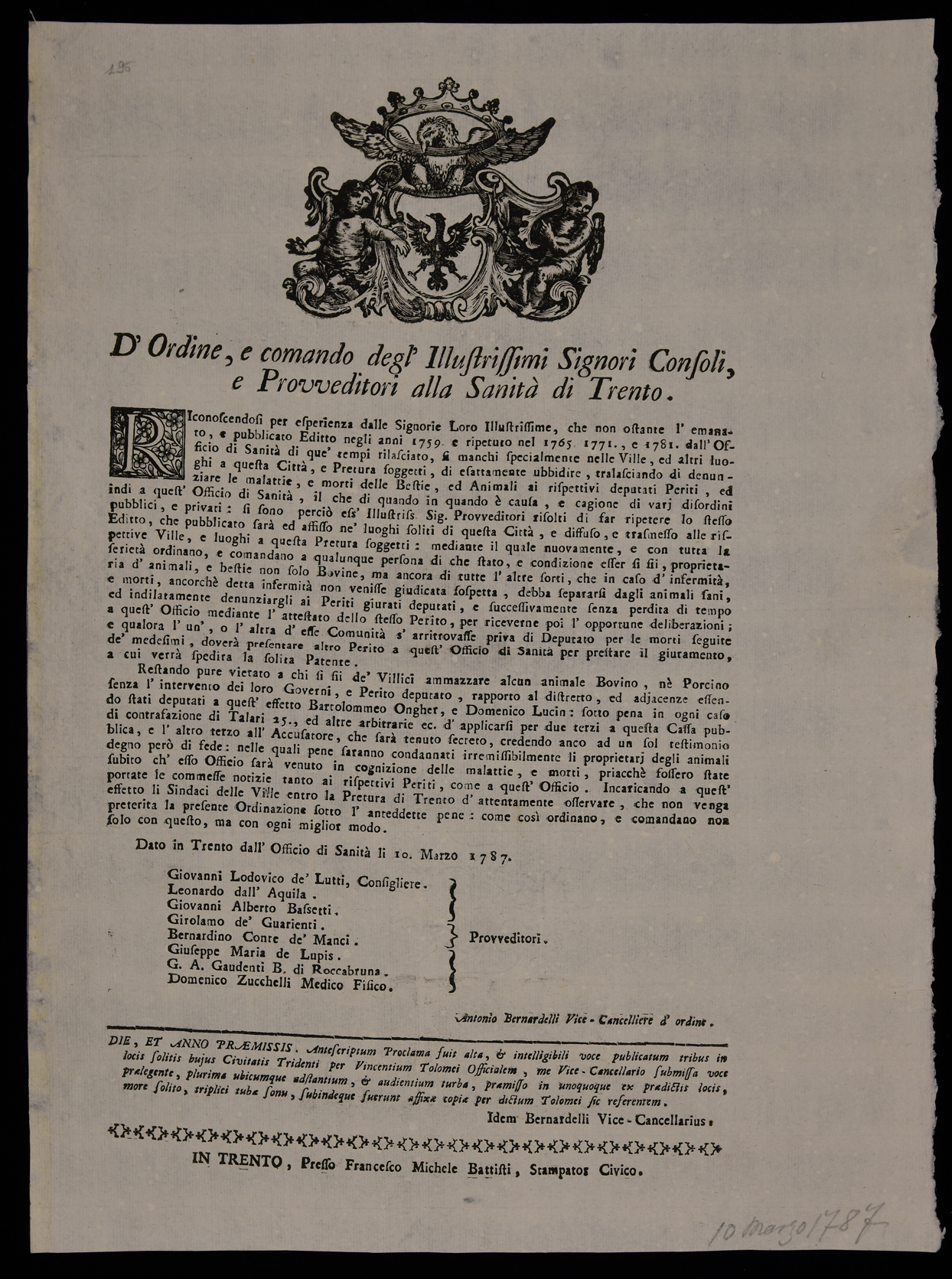 | D'ordine e comando degl'illustrissimi signori consoli e provveditori alla sanità di Trento |