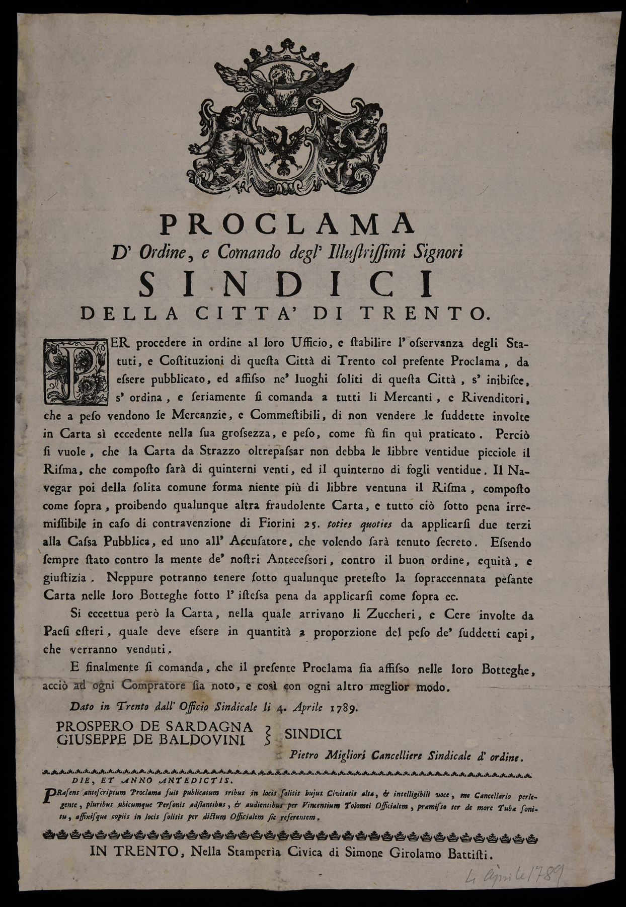 Proclama del Magistrato consolare di Trento sul peso della carta da involti, emanato il 4 aprile 1789, sottoscritto da Prospero Sardagna, Giuseppe de Baldovini e Pietro Migliori, testo della pubblicazione avvenuto a Trento il 4 aprile 1789 ad opera di Vincenzo Tolomei alla presenza di Pietro Migliori.