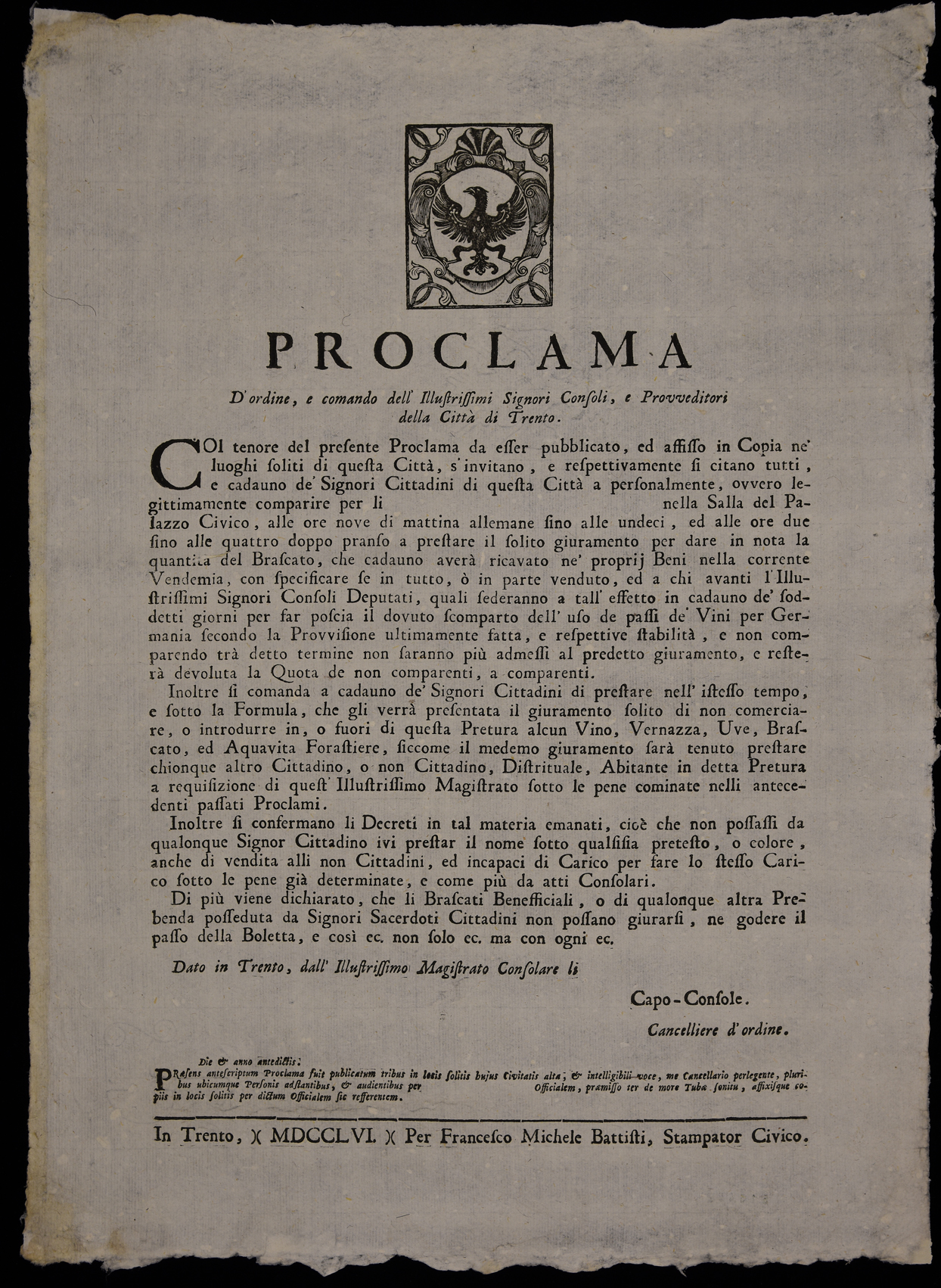 Proclama sulla vendemmia emanato nel 1756 dal Magistrato consolare di Trento, stemma del Magistrato consolare di Trento.