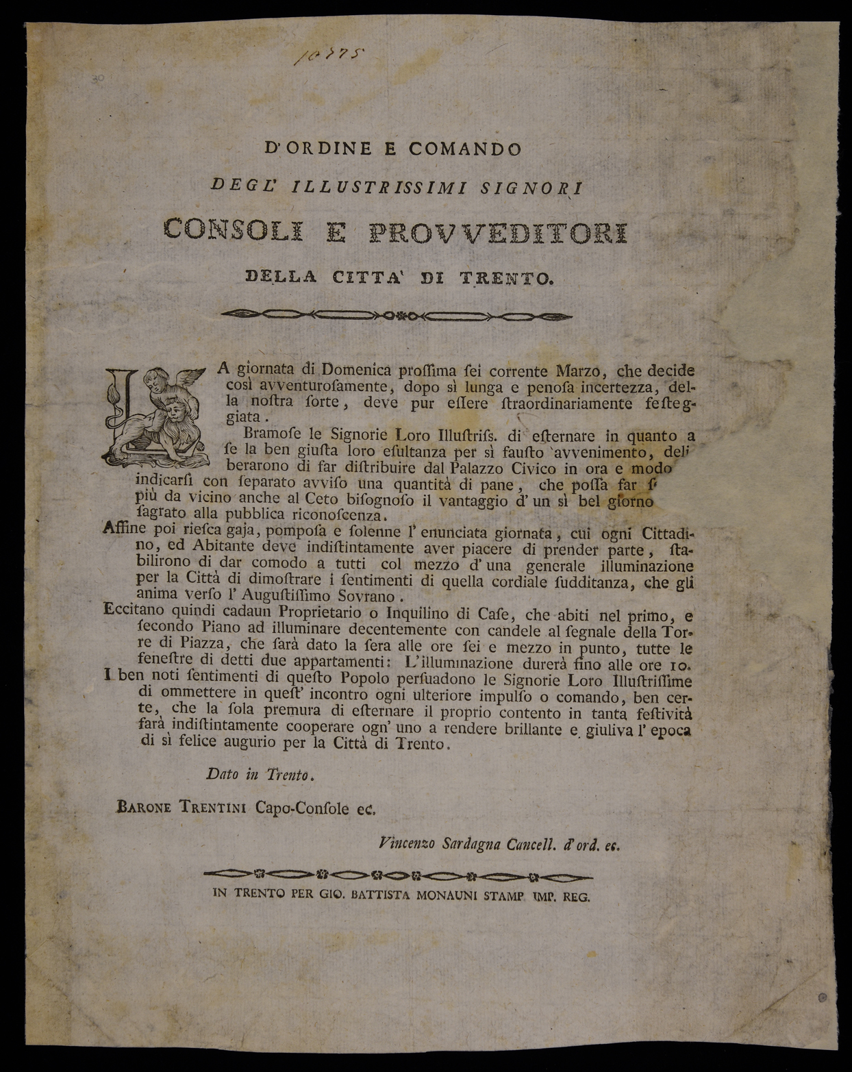 | D'ordine e comando degl'illustrissimi signori consoli e provveditori della città di Trento |
