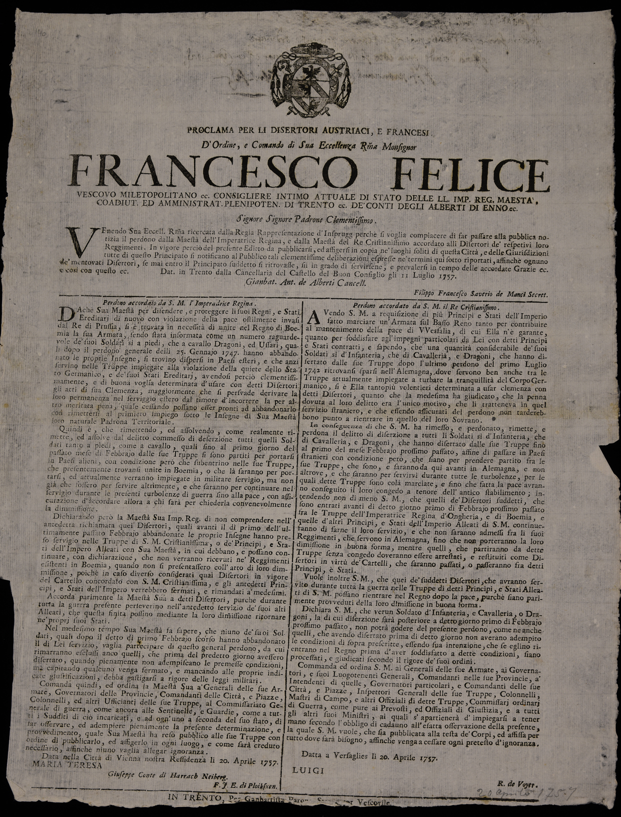 Proclama di Francesco Felice Alberti d'Enno sul perdono ai disertori degli eserciti austriaco e francese, emanato l'11 luglio 1757, sottoscritto da Giambattista Antonio Alberti (cancelliere), da Filippo Francesco Saverio Manci (segretario), da Giuseppe conte di Harrach, da F. J. E. di Ploiksxen e da R. de Voyer.