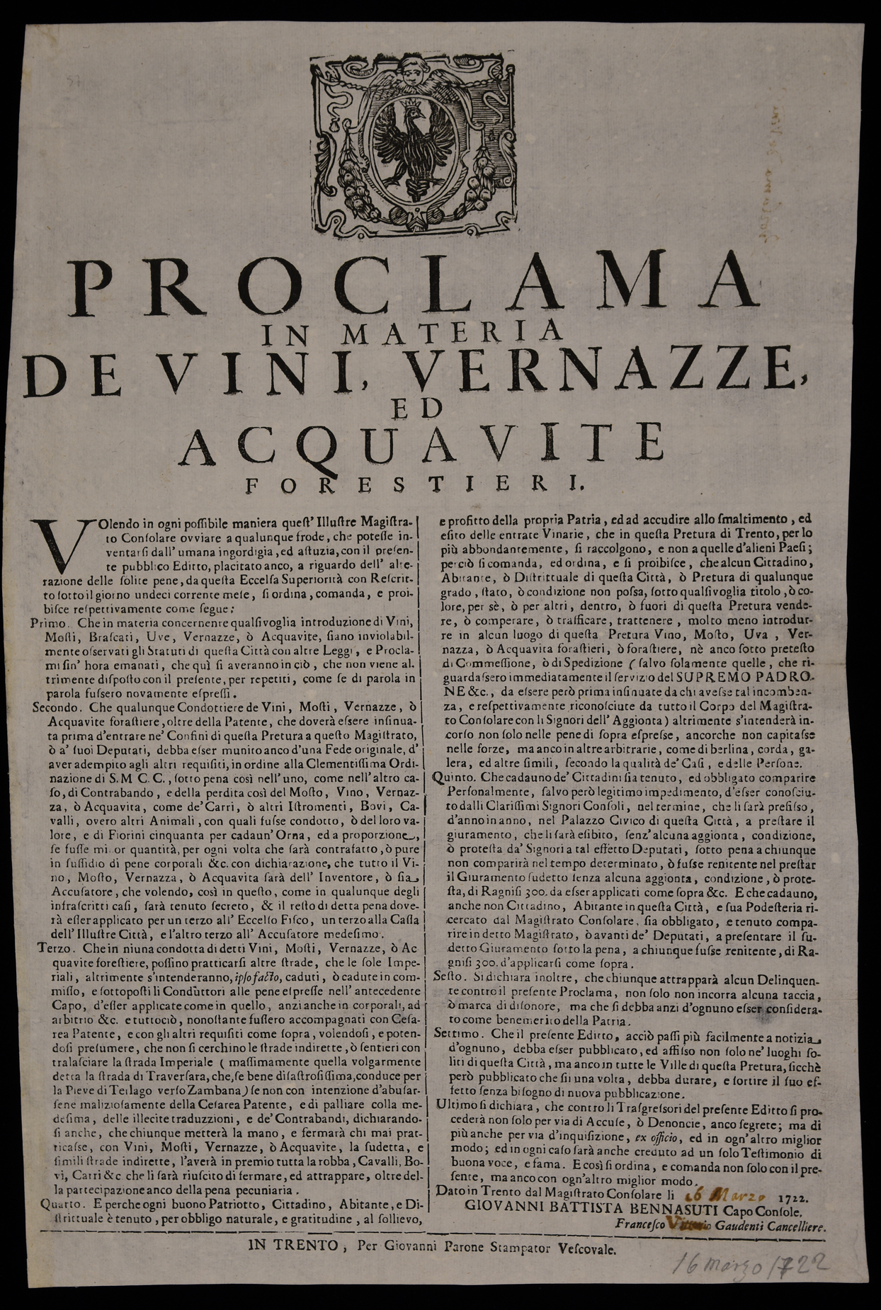 Proclama sui vini e grappe emanato il 16 marzo 1722 dal Magistrato Consolare di Trento, data di emanazione da una nota manoscritta sull'esemplare della Biblioteca comunale di Trento, stemma del Magistrato consolare di Trento, esiste una variante priva di data e sottoscrizione.