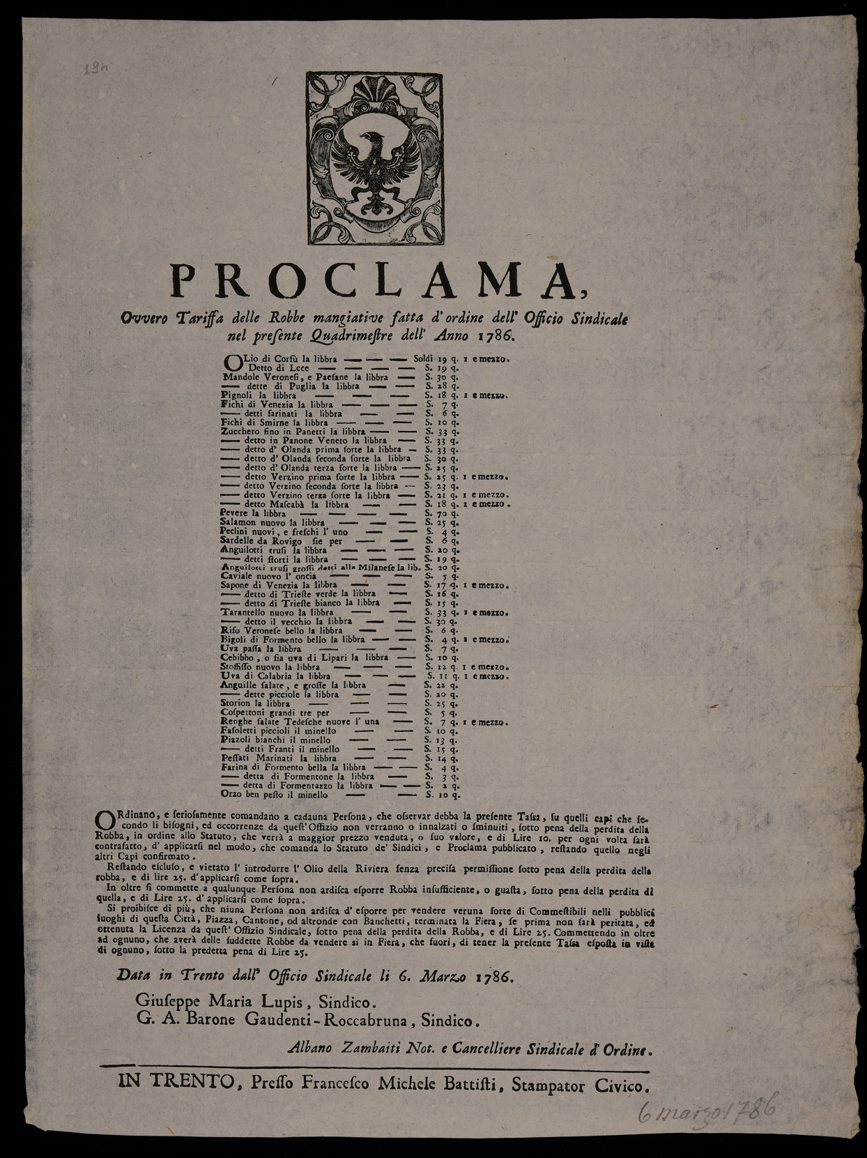 Proclama del Magistrato consolare di Trento sul prezzo dei generi alimentari, emanato il 6 marzo 1786, sottoscritto da Giuseppe Maria Lupis, Gaudenzio Antonio Gaudenti e Albano Zambaiti.