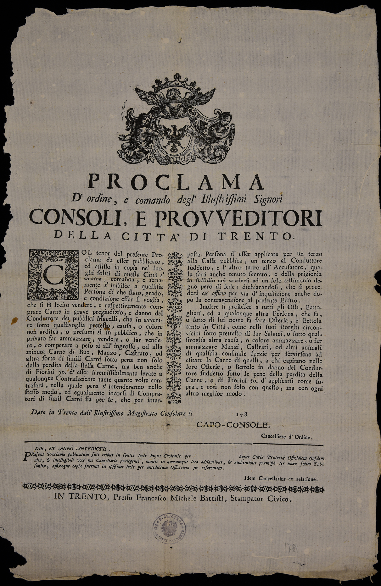 | Proclama d'ordine, e comando degl'illustrissimi signori consoli, e provveditori della città di Trento |