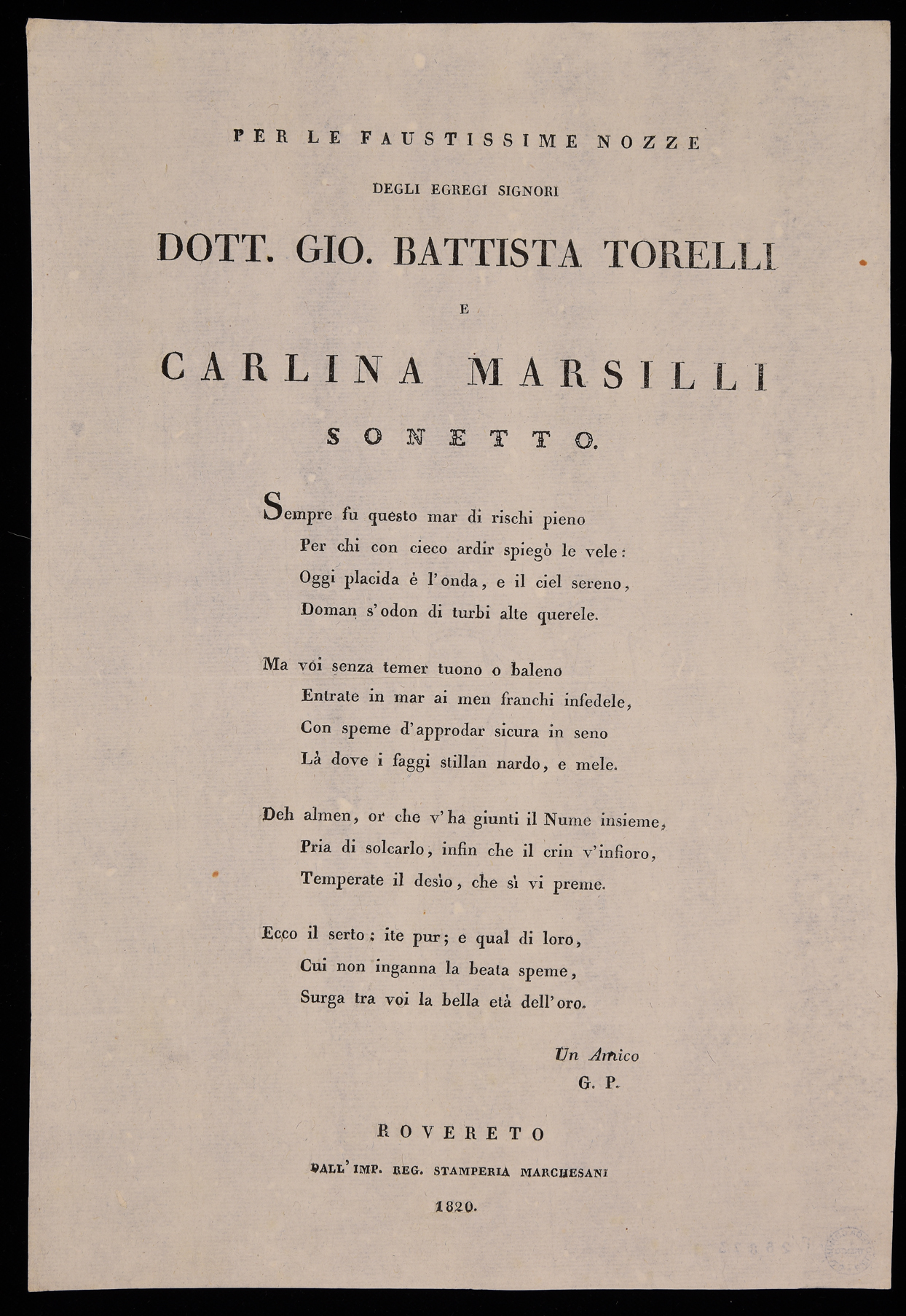 | Per le faustissime nozze degli egregi signori dott. Gio. Battista Torelli e Carlina Marsilli, sonetto |