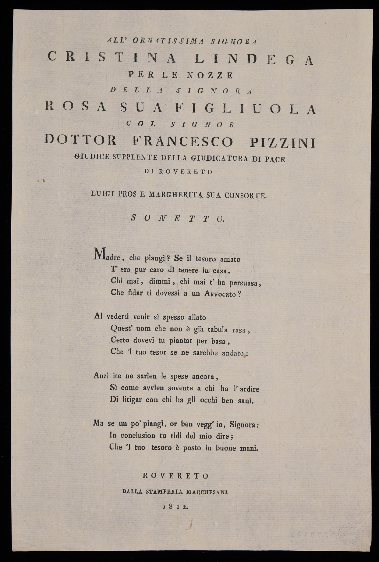 | All'ornatissima signora Cristina Lindega per le nozze della signora Rosa sua figliuola col signor dottor Francesco Pizzini giudice supplente della giudicatura di pace di rovereto Luigi Pros e Margherita sua consorte, sonetto |