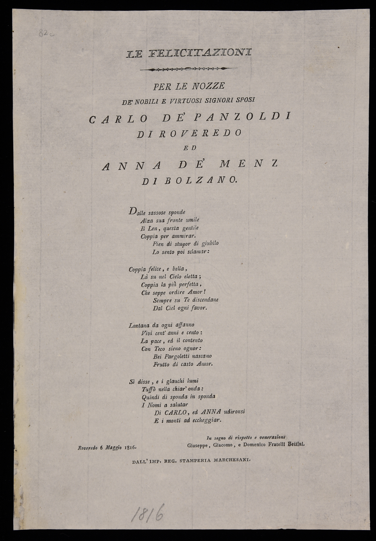 | Le felicitazioni per le nozze de' nobili e virtuosi signori sposi Carlo de' Panzoldi di Roveredo ed Anna de' Menz di Bolzano |