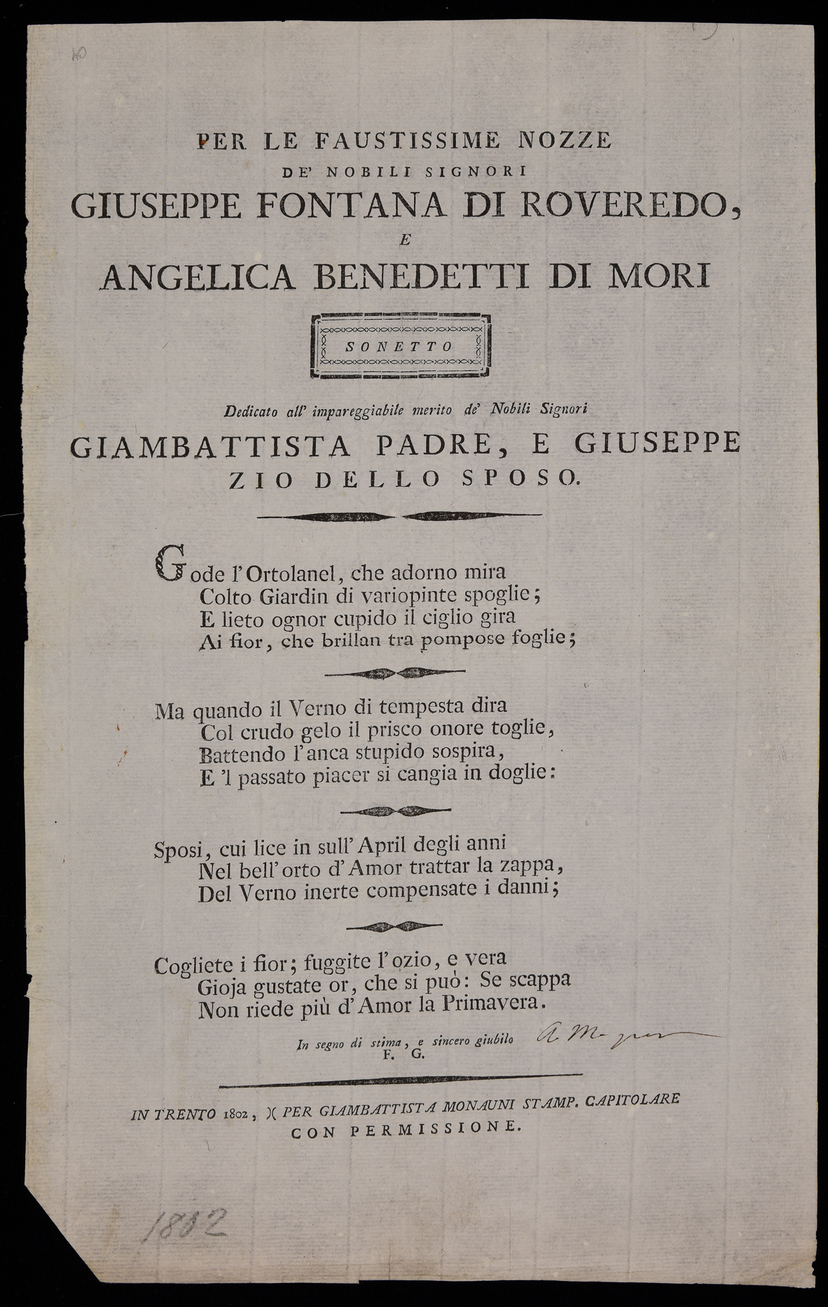 | Per le faustissime nozze de' nobili signori Giuseppe Fontana di Roveredo, e Angelica Benedetti di Mori, sonetto dedicato all'impareggiabile merito de' nobili signori Giambattista padre, e Giuseppe zio dello sposo |