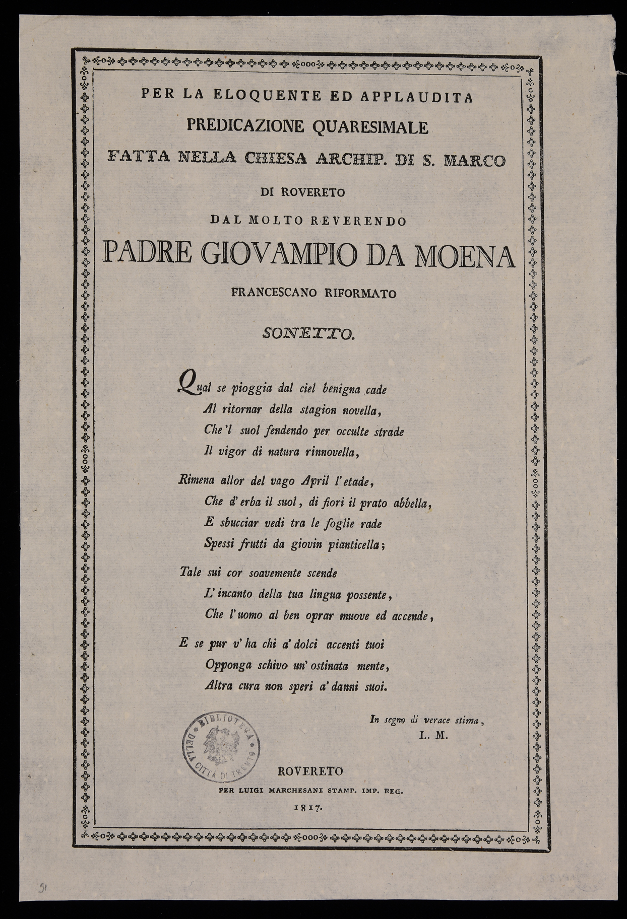 | Per la eloquente ed applaudita predicazione quaresimale fatta nella chiesa archip. di S. Marco di Rovereto dal molto reverendo padre Giovampio da Moena francescano riformato, sonetto |