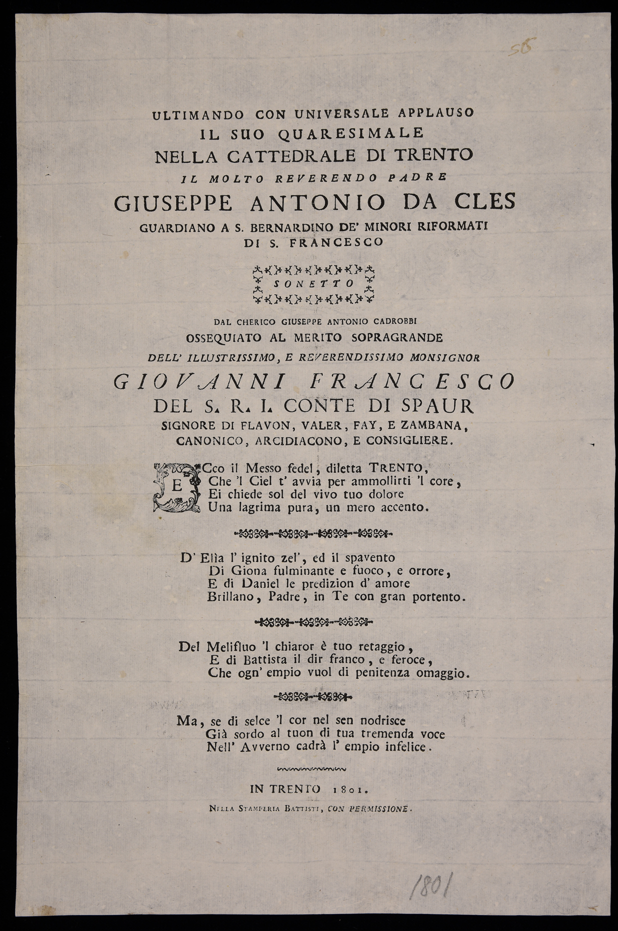 | Ultimando con universale applauso il suo quaresimale nella cattedrale di Trento il molto reverendo padre Giuseppe Antonio da Cles guardiano a S. Bernardino de' minori Riformati di S. Francesco, sonetto dal cherico Giuseppe Antonio Cadrobbi ossequiato al merito sopragrande dell'illustrissimo, e reverendissimo monsignor Giovanni Francesco del S.R.I. conte di Spaur ... |