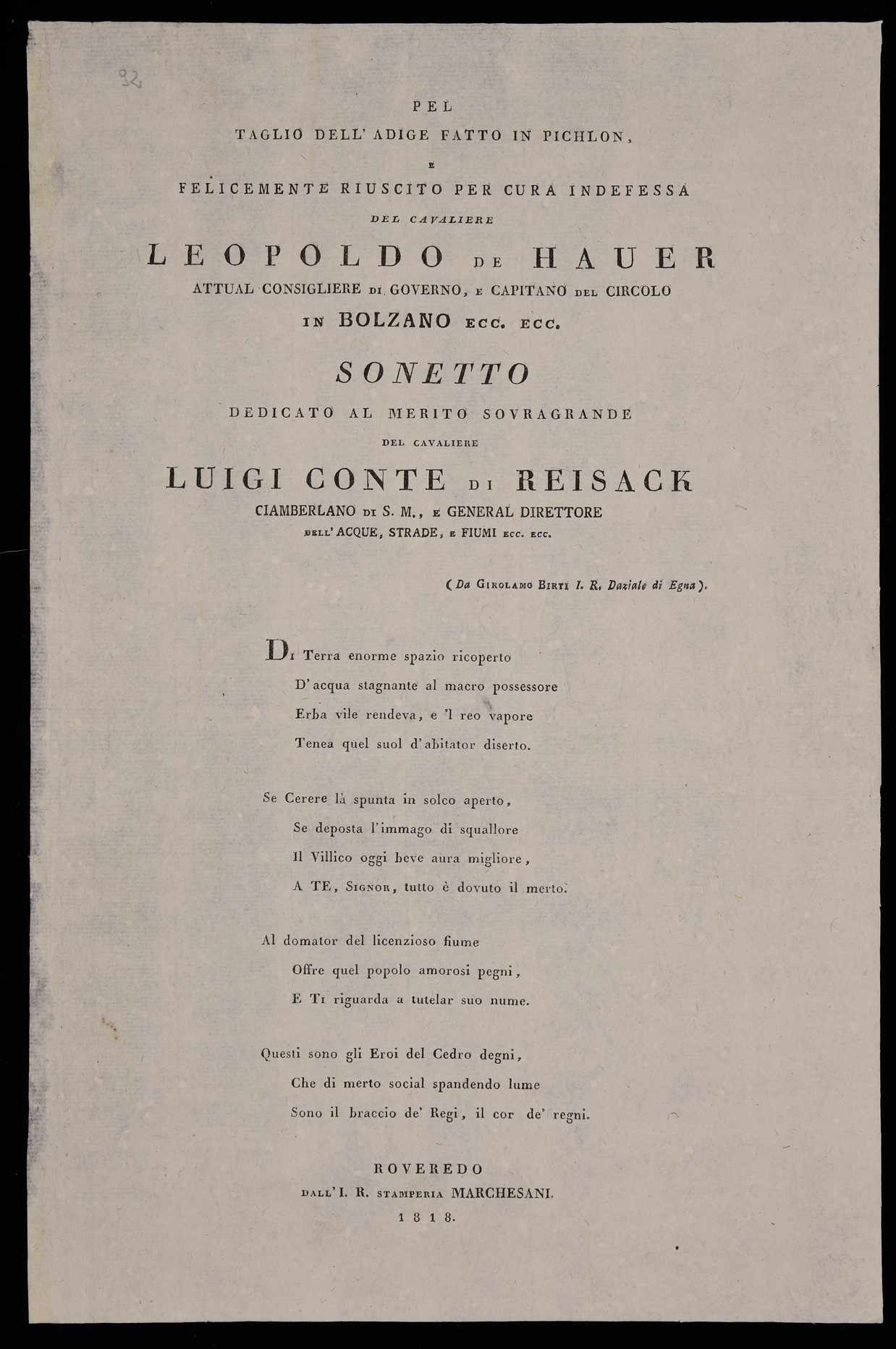 | Pel taglio dell'Adige fatto in Pichlon, e felicemente riuscito per cura indefessa del cavaliere Leopoldo de Hauer attual consigliere di governo, e capitano del circolo in Bolzano ecc. ecc., sonetto dedicato al merito sovragrande del cavaliere Luigi conte di Reisack ciamberlano di S.M., e general direttore dell'acque, strade, e fiumi ecc. ecc. |