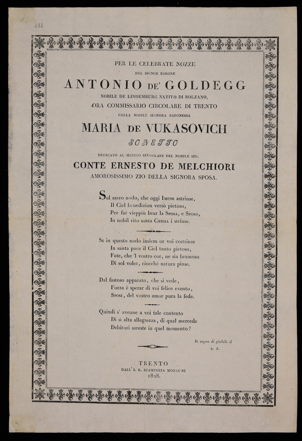 | Per le celebrate nozze del signor barone Antonio de' Goldegg nobile de Lindemburg nativo di Bolzano, ora commissario circolare di Trento colla nobile signora baronessa Maria de Vukasovich, sonetto dedicato al merito singolare del nobile sig. conte Ernesto de Melchiori amorosissimo zio della signora sposa |