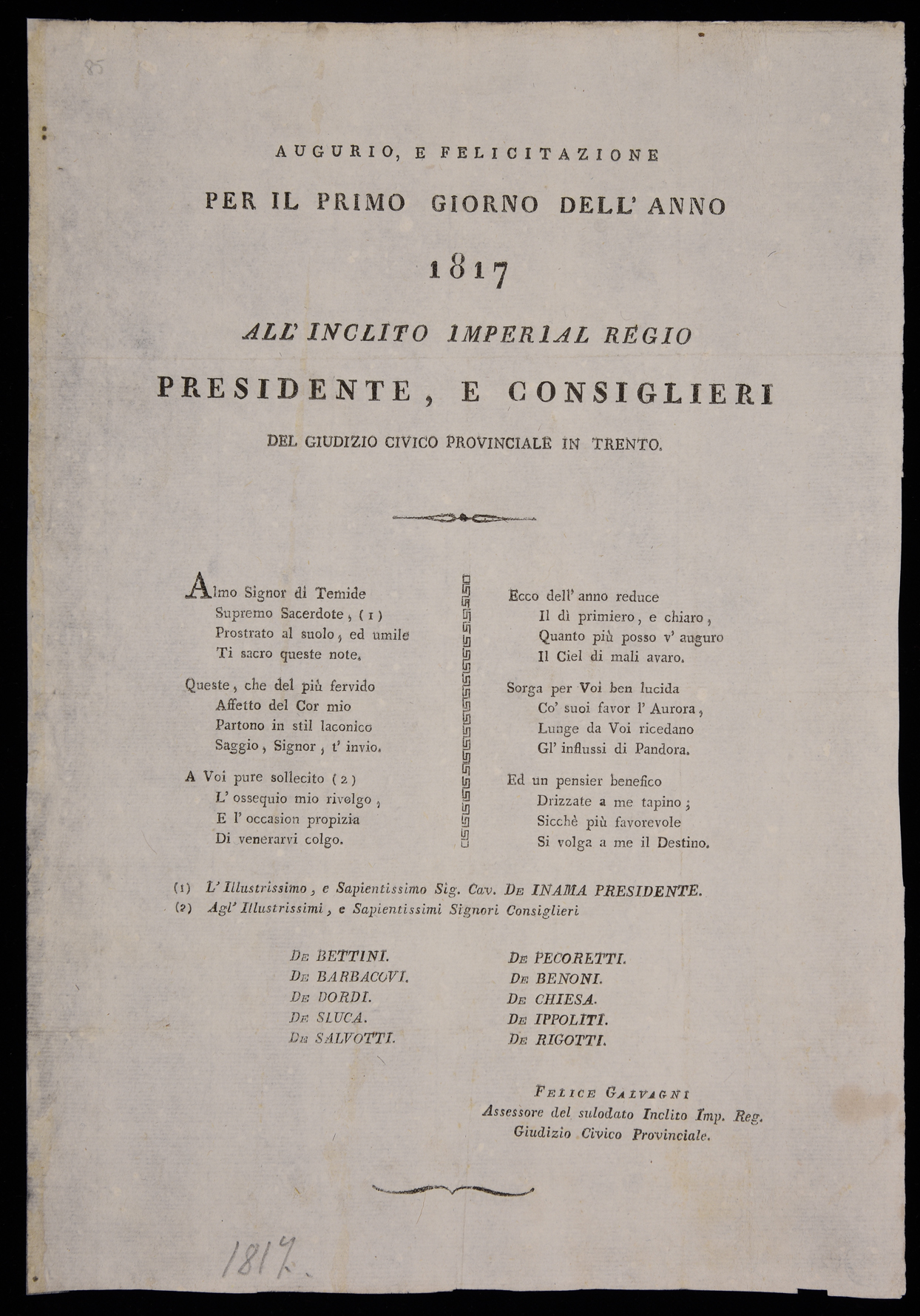 | Augurio, e felicitazione per il primo giorno dell'anno 1817 all'inclito imperial regio presidente, e consiglieri del giudizio civico provinciale in Trento |