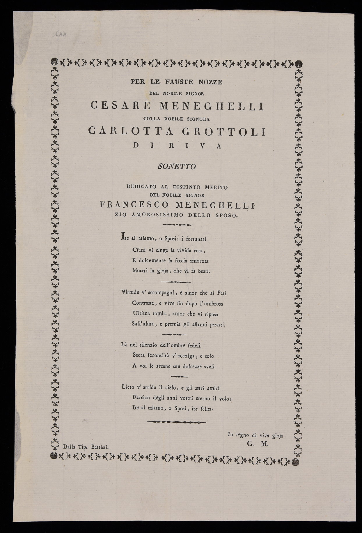 | Per le fauste nozze del nobile signor Cesare Meneghelli colla nobile signora Carlotta Grottoli di Riva, sonetto dedicato al distinto merito del nobile signor Francesco Meneghelli zio amorosissimo dello sposo |
