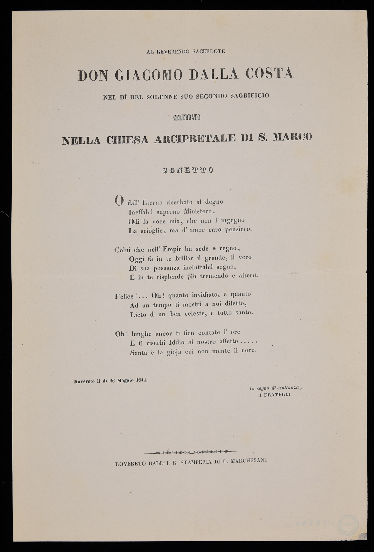 | Al reverendo sacerdote don Giacomo dalla Costa nel dì del solenne suo secondo sagrificio celebrato nella chiesa arcipretale di S. Marco, sonetto |
