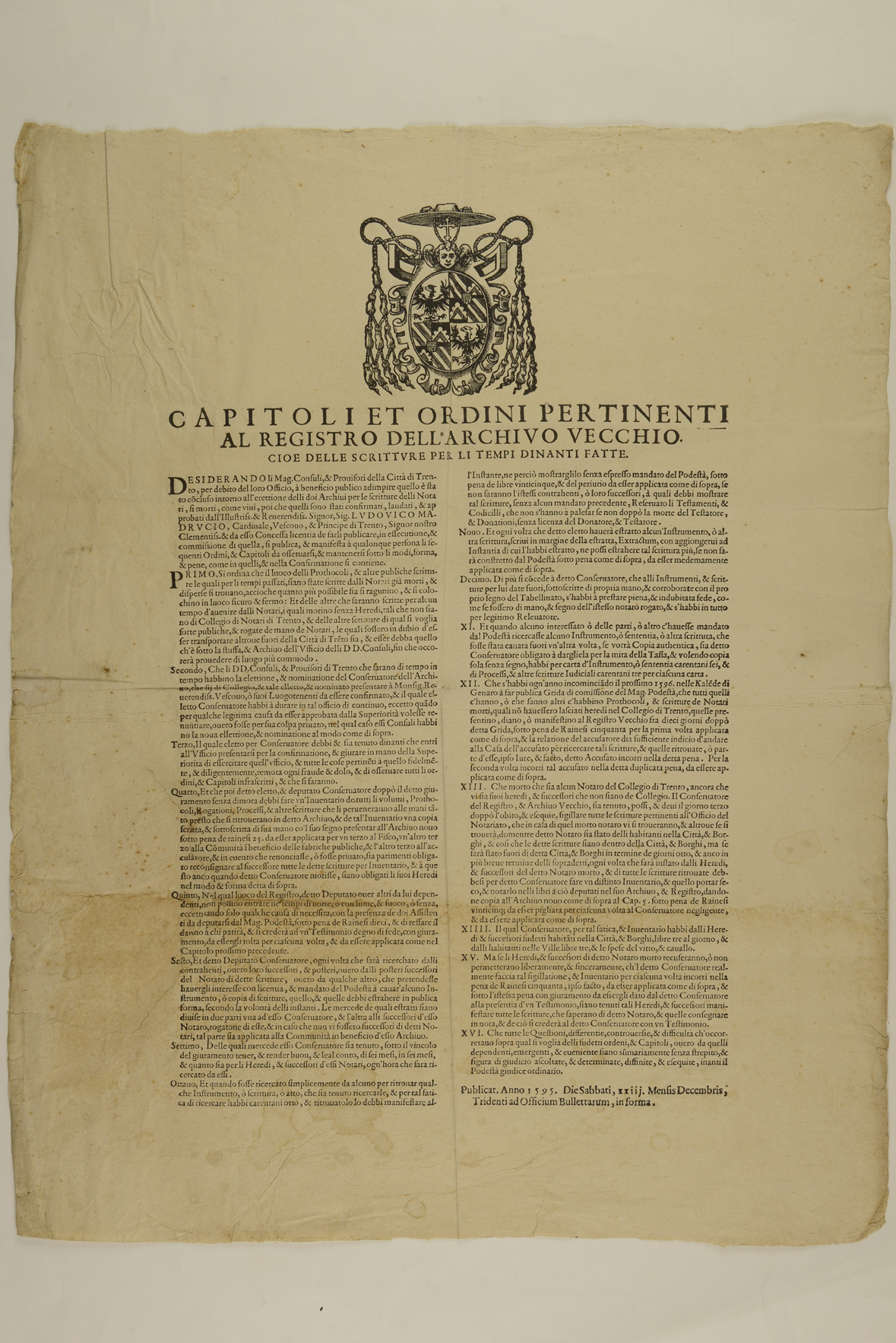 Proclama sull'archivio notarile, emanato da Lodovico Madruzzo, principe-vescovo di Trento, e pubblicato il 23 dicembre 1595