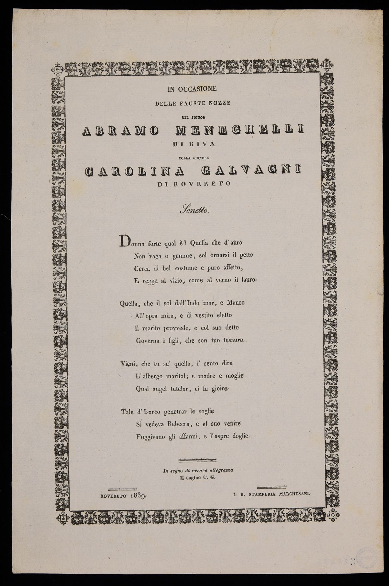 | In occasione delle fauste nozze del signor Abramo Meneghelli di Riva colla signora Carolina Galvagni di Rovereto, sonetto |