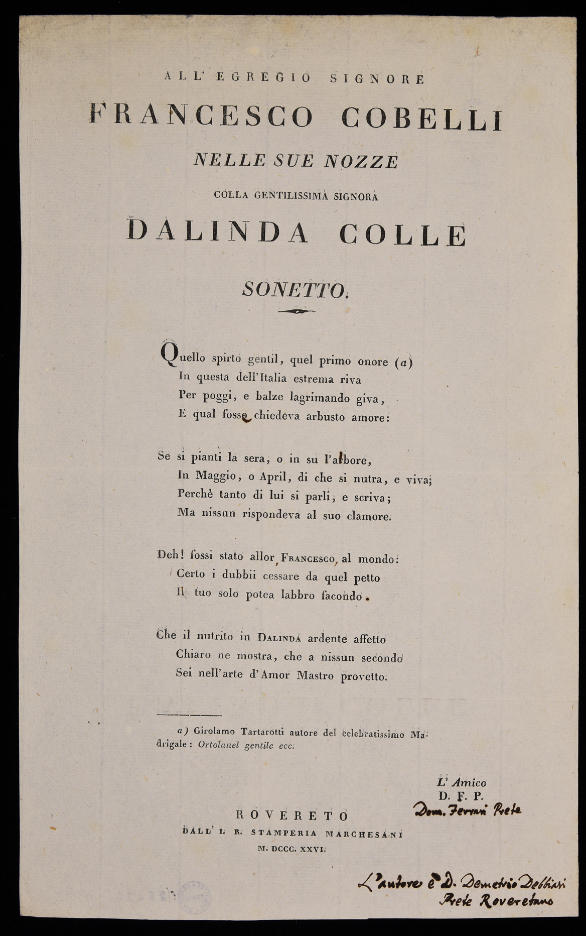 All'egregio signore Francesco Cobelli nelle sue nozze colla gentilissima...