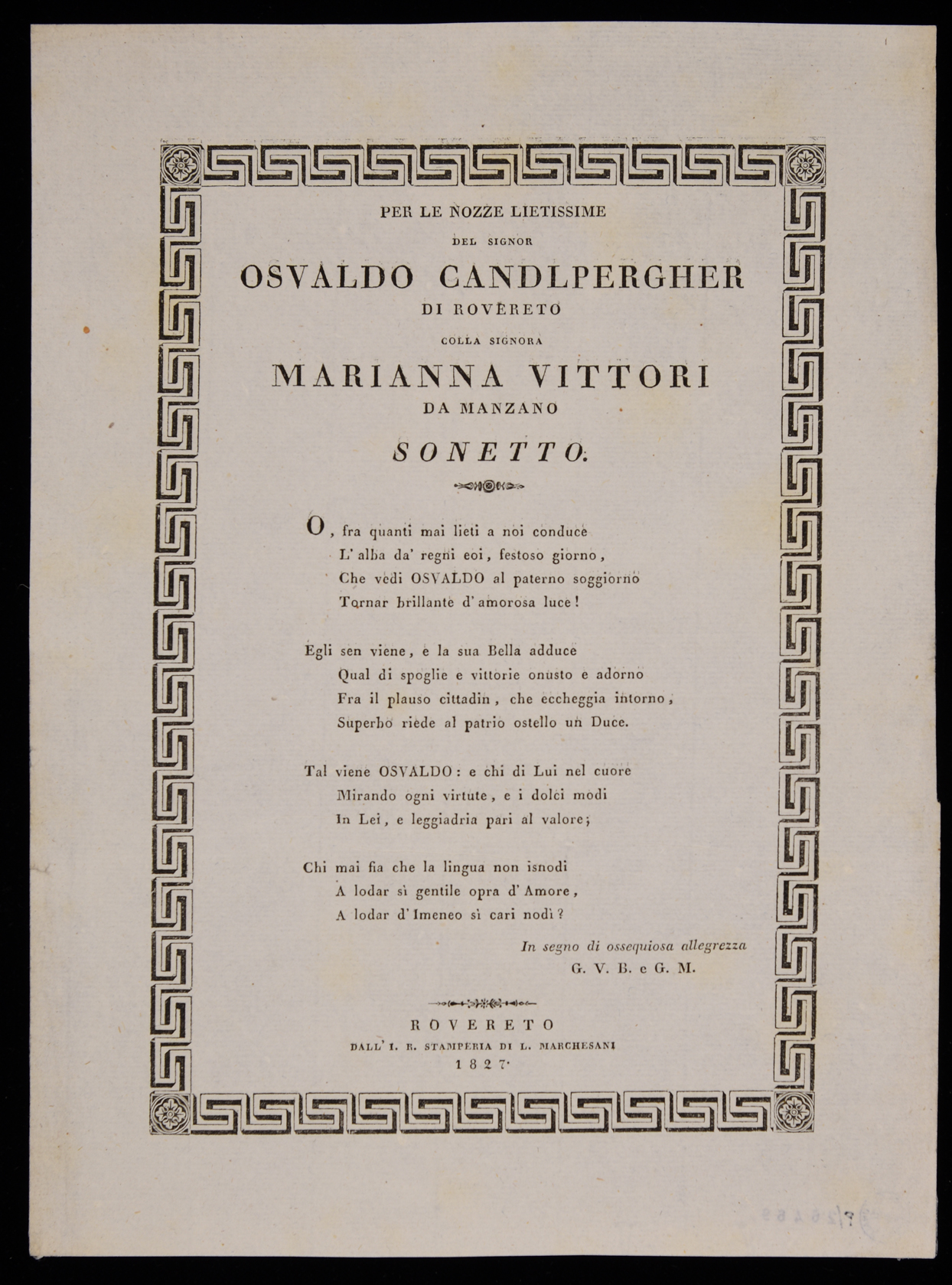 | Per le nozze lietissime del signor Osvaldo Candlpergher di Rovereto colla signora Marianna Vittori da Manzano, sonetto |