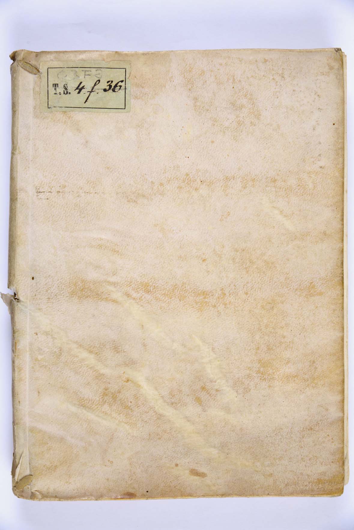 Legatura all’olandese in pergamena, XVII secolo, 2 cc. di guardia (anteriore e posteriore), titolo manoscritto sul dorso e sul taglio inferiore, mm. 205x150x25.