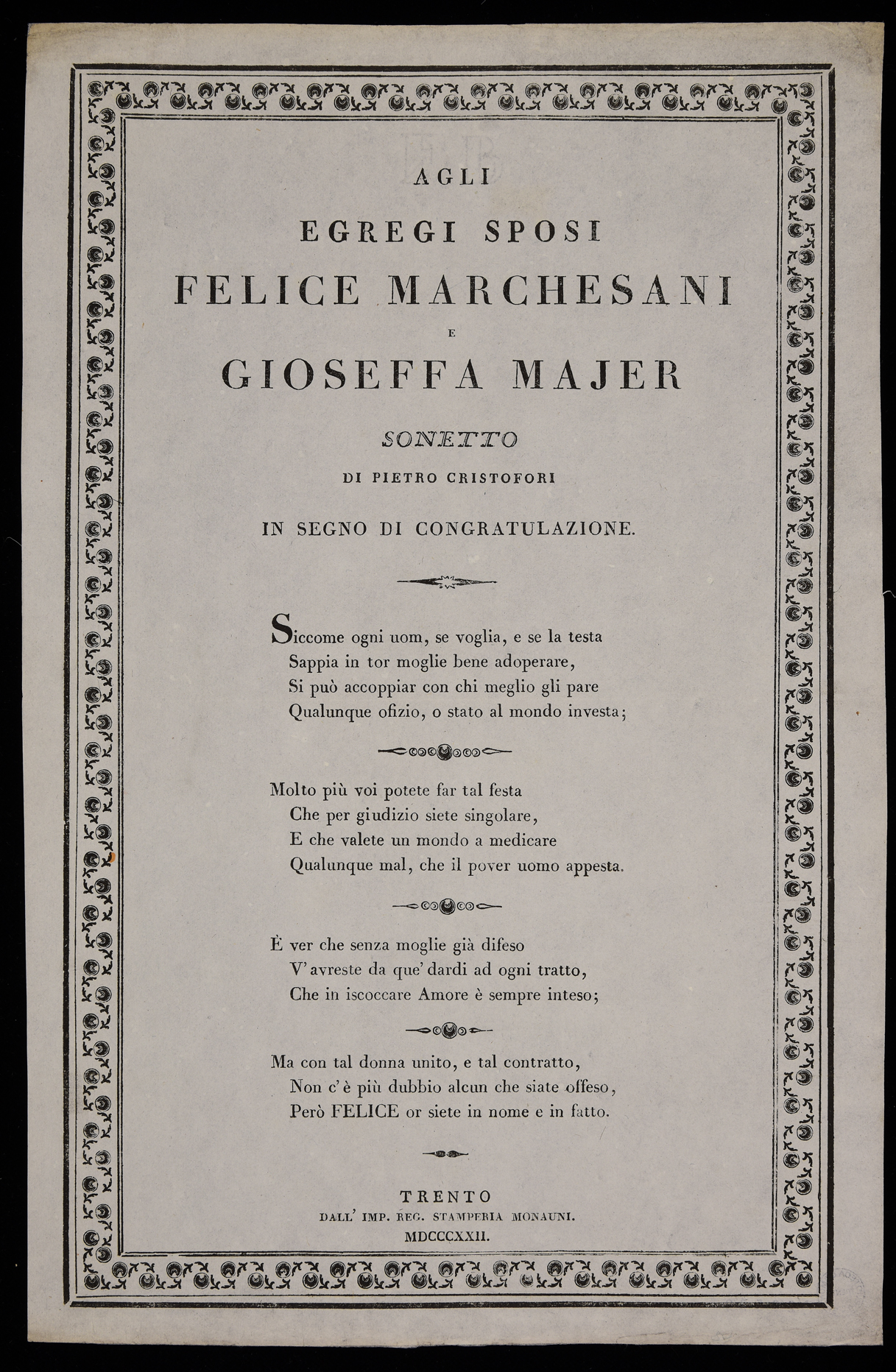 | Agli egregi sposi Felice Marchesani e Gioseffa Majer, sonetto di Pietro Cristofori in segno di congratulazione |