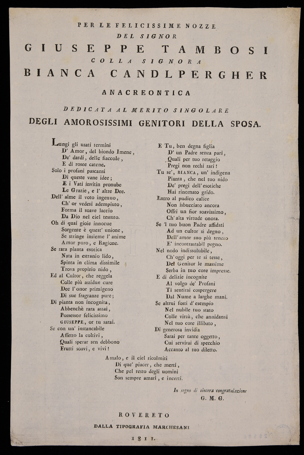 | Per le felicissime nozze del signor Giuseppe Tambosi colla signora Bianca Candlpergher, anacreontica dedicata al merito singolare degli amorosissimi genitori della sposa |
