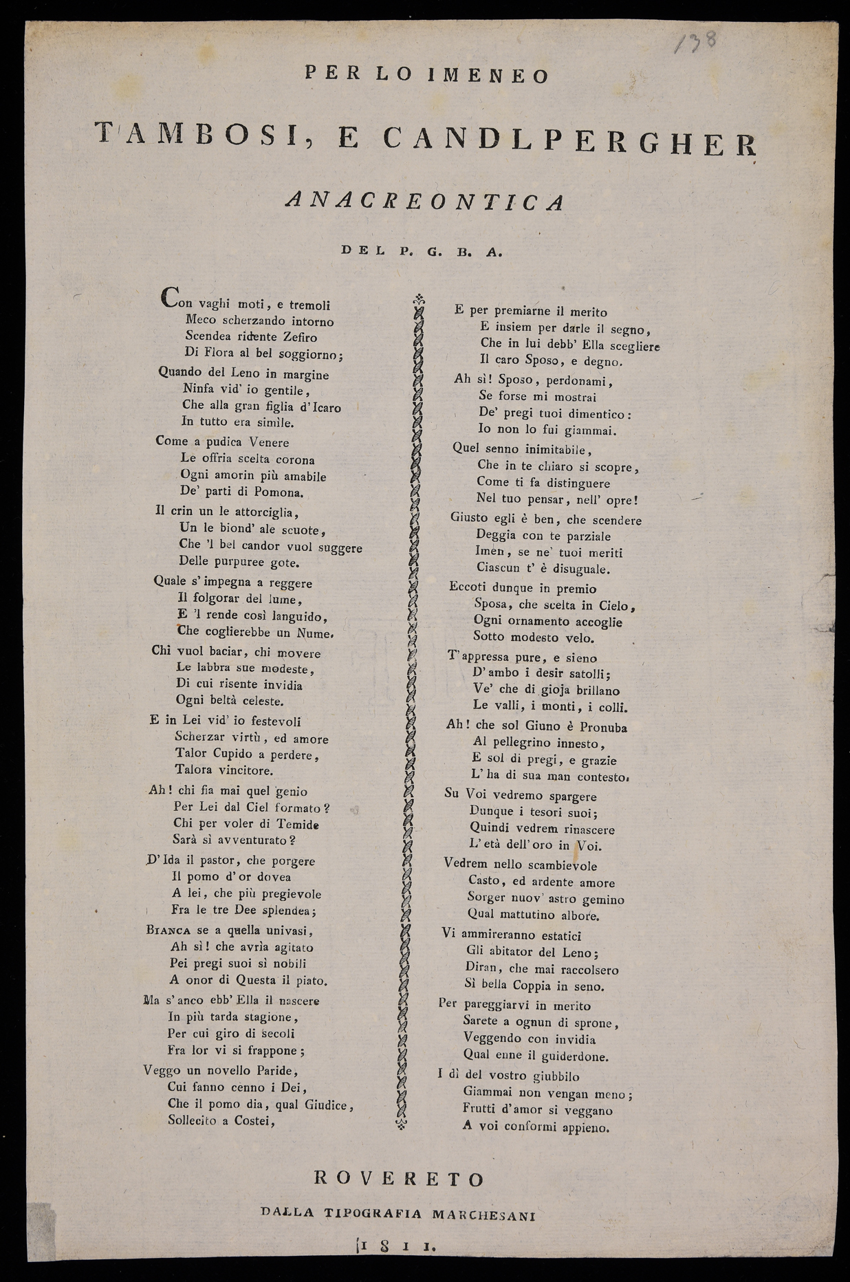 | Per lo imeneo Tambosi, e Candlpergher, anacreontica del P.G.B.A. |