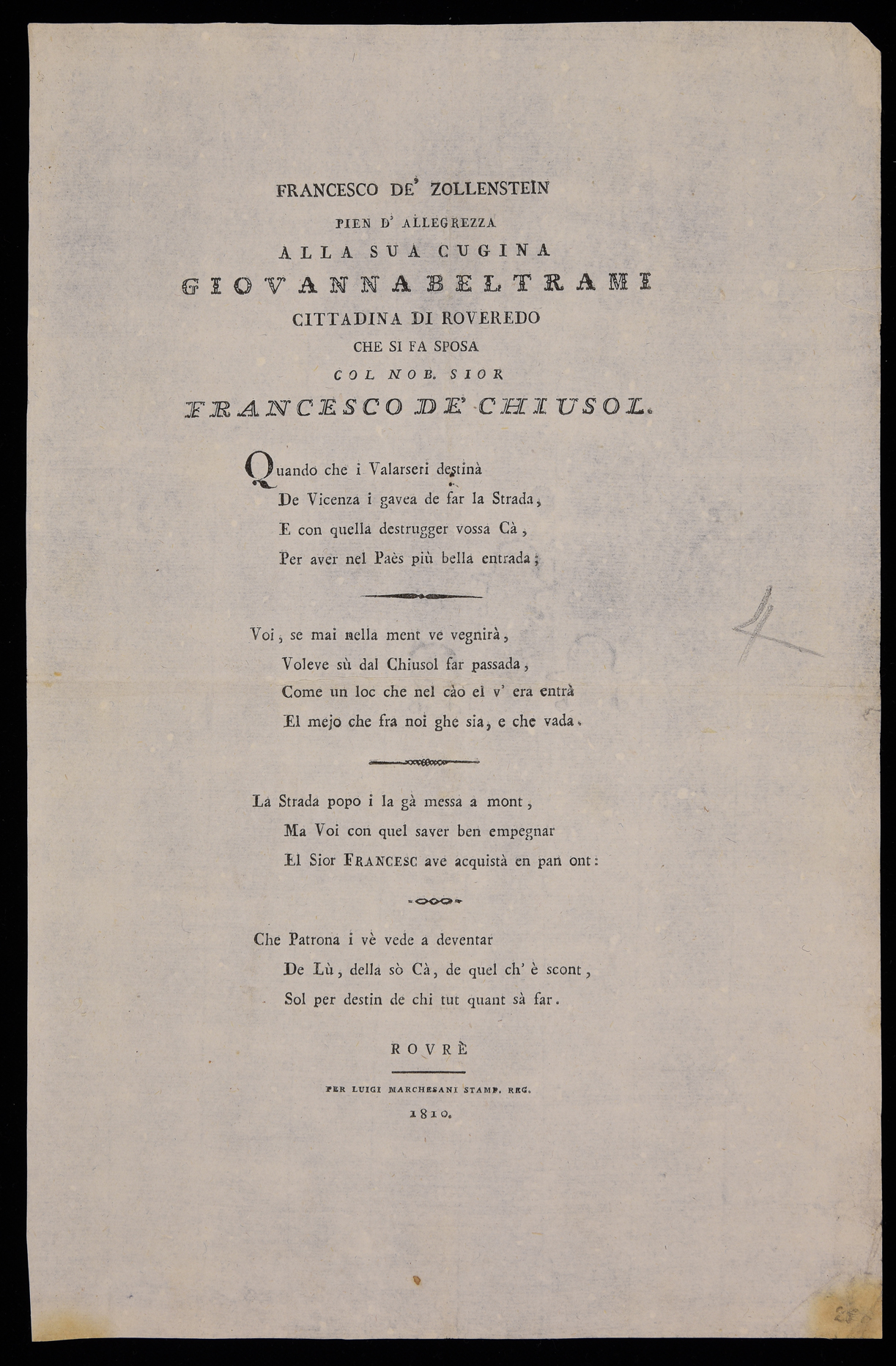 | Francesco de' Zollenstein pien d'allegrezza alla sua cugina Giovanna Beltrami cittadina di Roveredo che si fa sposa col nob. sior Francesco de' Chiusol |