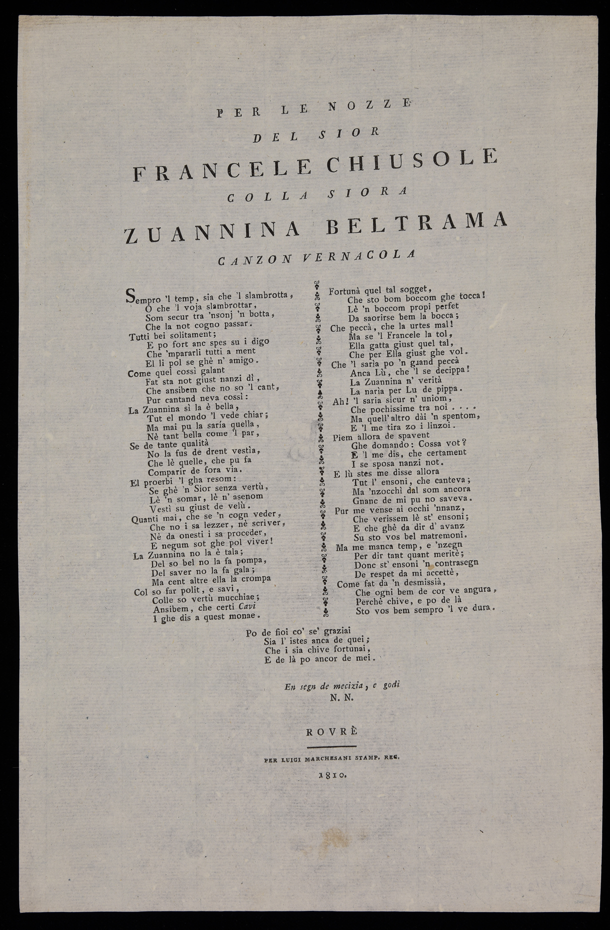 | Per le nozze del sior Francele Chiusole colla siora Zuannina Beltrama, canzon vernacola |