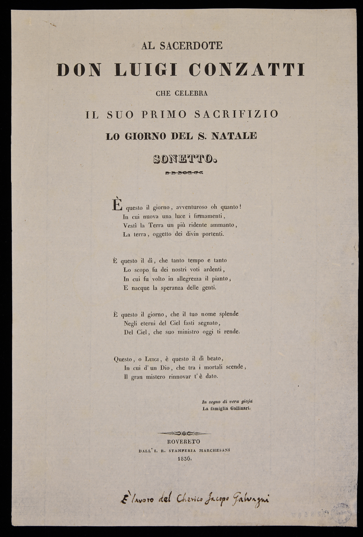 | Al sacerdote don Luigi Conzatti che celebra il suo primo sacrifizio lo giorno del S. Natale, sonetto |