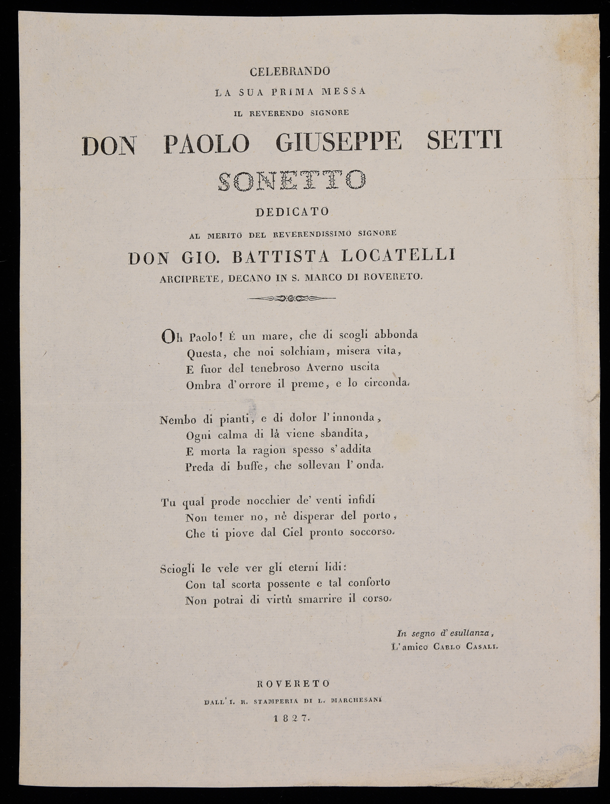 | Celebrando la sua prima messa il reverendo signore don Paolo Giuseppe Setti, sonetto dedicato al merito del reverendissimo signore don Gio. Battista Locatelli arciprete, decano in S. Marco di Rovereto |
