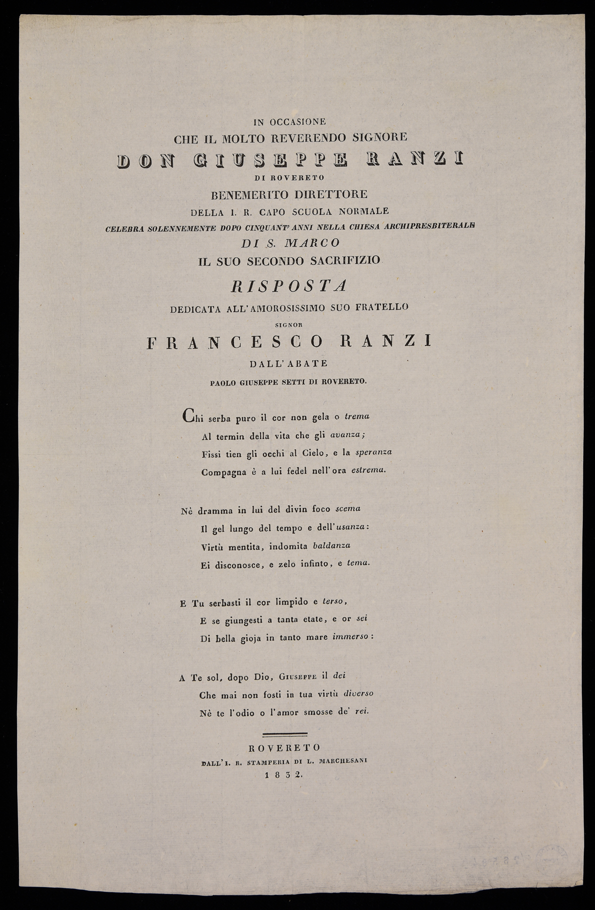 | In occasione che il molto reverendo don Giuseppe Ranzi di Rovereto benemerito direttore della I.R. capo scuola normale celebra solennemente dopo cinquant'anni nella chiesa archipresbiterale di S. Marco il suo secondo sacrifizio, risposta dedicata all'amorosissimo suo fratello signor Francesco Ranzi dall'abate Paolo Giuseppe Setti di Rovereto |