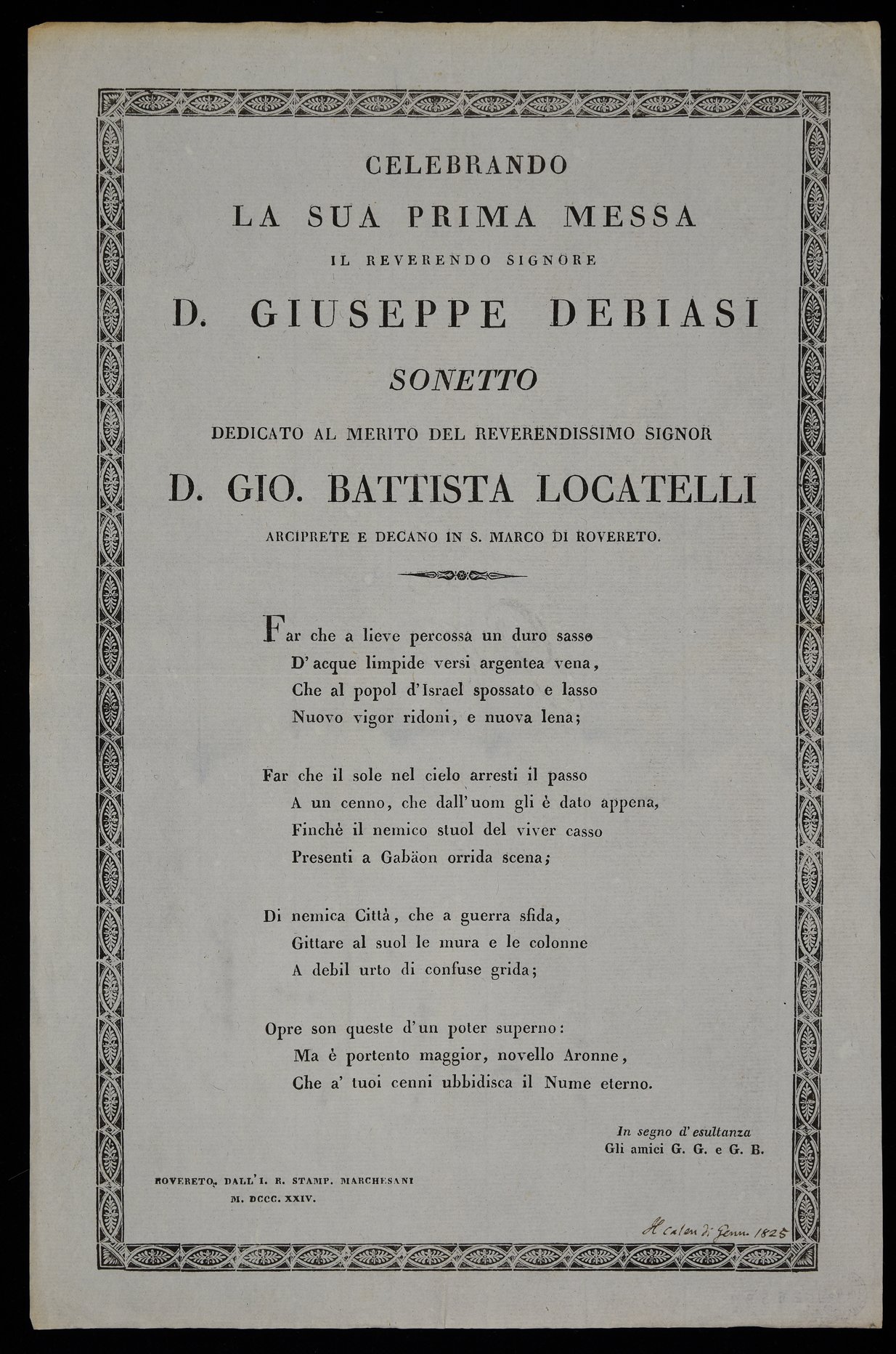 | Celebrando la sua prima messa il reverendo signore d. Giuseppe Debiasi, sonetto dedicato al merito del reverendissimo signor d. Gio. Battista Locatelli arciprete e decano in S. Marco di Rovereto |