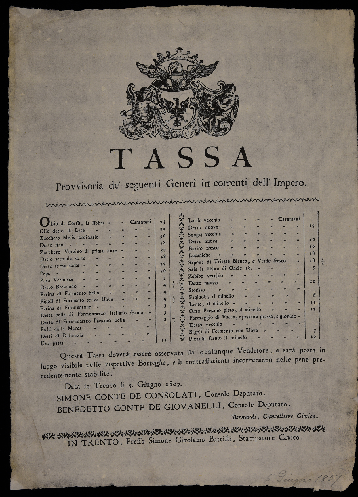 Proclama del Magistrato consolare di Trento sulla tassazione dei generi alimentari, emanato il 5 giugno 1807, sottoscritto da Simone Consolati, Benedetto Giovanelli e dal cancelliere Bernardi.