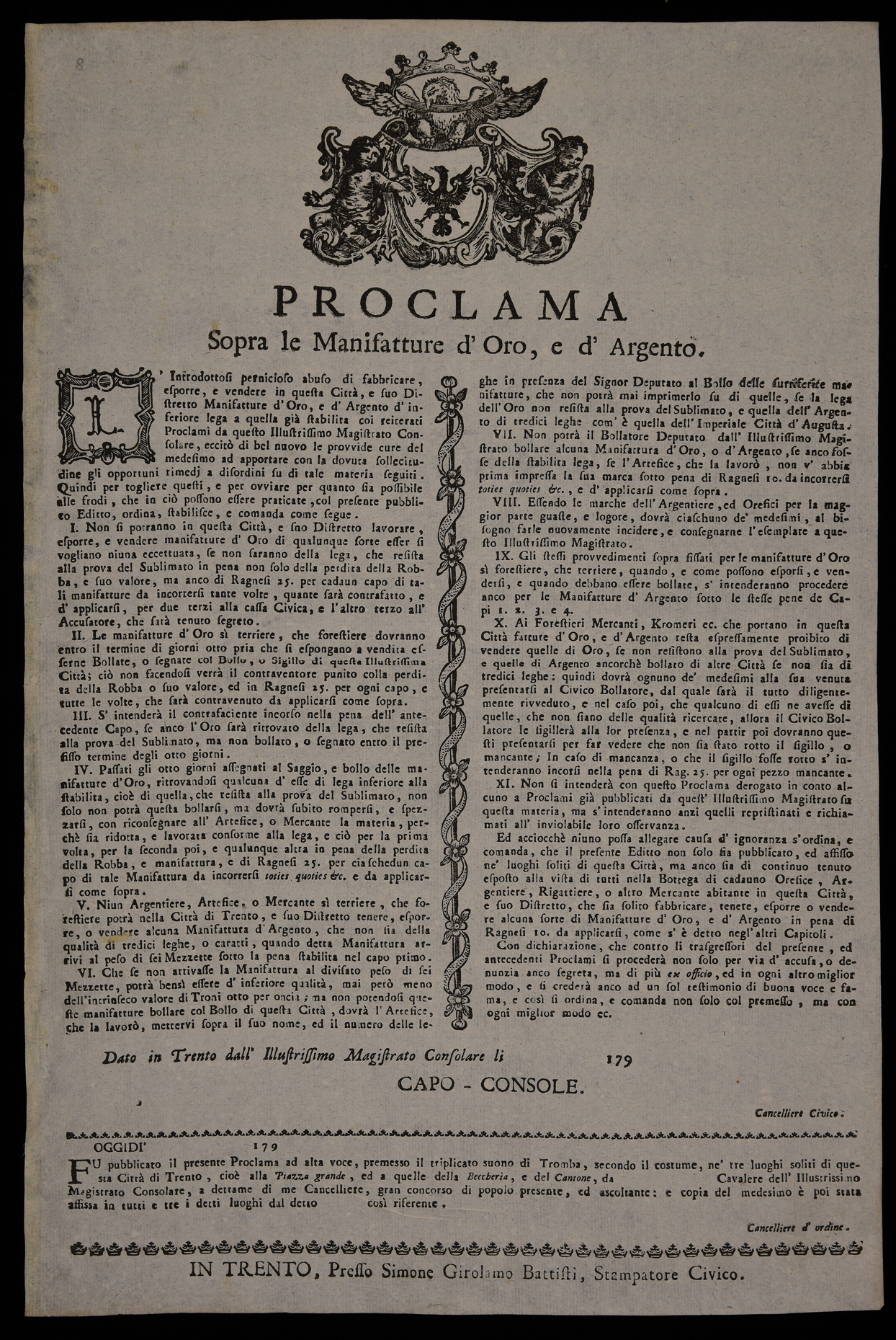 Proclama del Magistrato consolare di Trento sull'oreficeria, emanato il 10 luglio 1792.