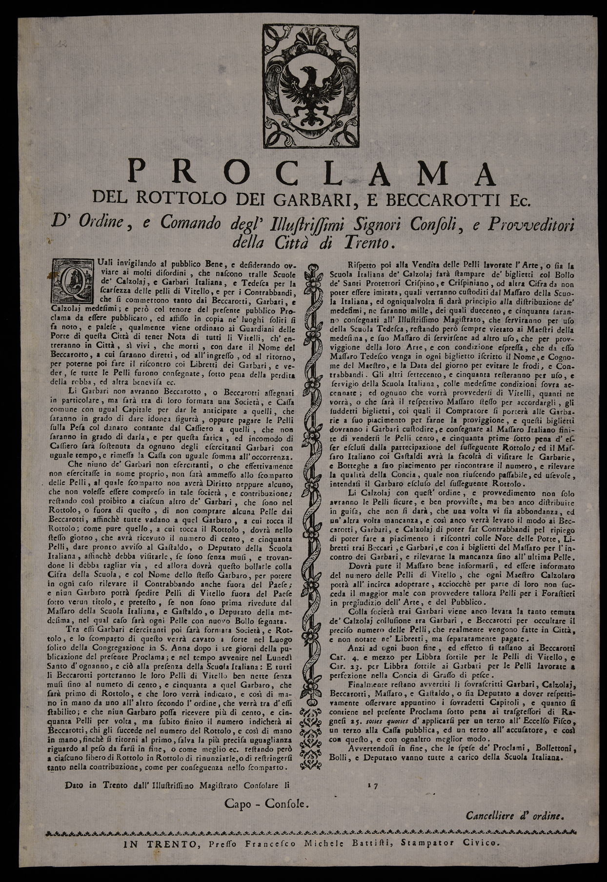 | Proclama del rottolo dei garbari, e beccarotti ec. D'ordine, e comando degl'illustrissimi signori consoli, e provveditori della città di Trento |