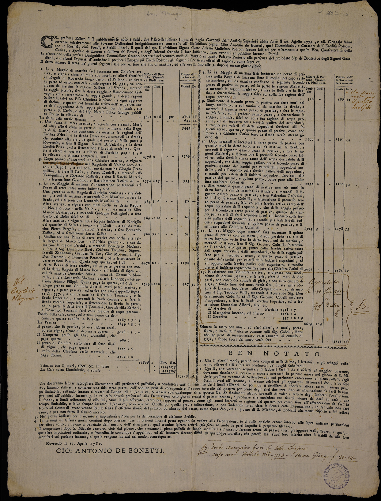 Proclama dell'autorità centrale che impone la vendita all'incanto (asta pubblica) dell'eredità Pedroni, emanato il 13 aprile 1780, sottoscritto da Giovanni Antonio Bonetti, Commissario designato.