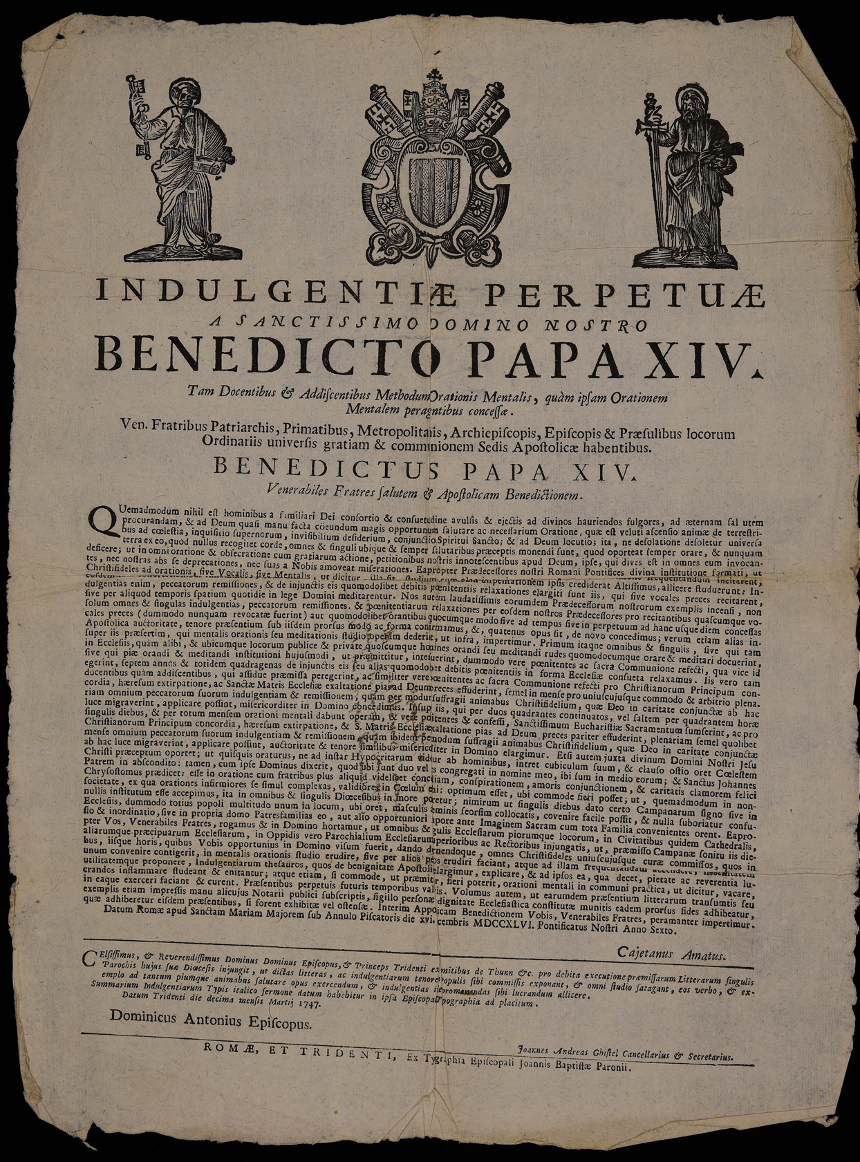 Data di stampa dalla data di emanazione in calce al testo: Trento, 10 marzo 1747, stemma di papa Benedetto XIV, sottoscritto da Domenico Antonio (vescovo) e da Giovanni Andrea Ghistel (cancelliere e segretario)
