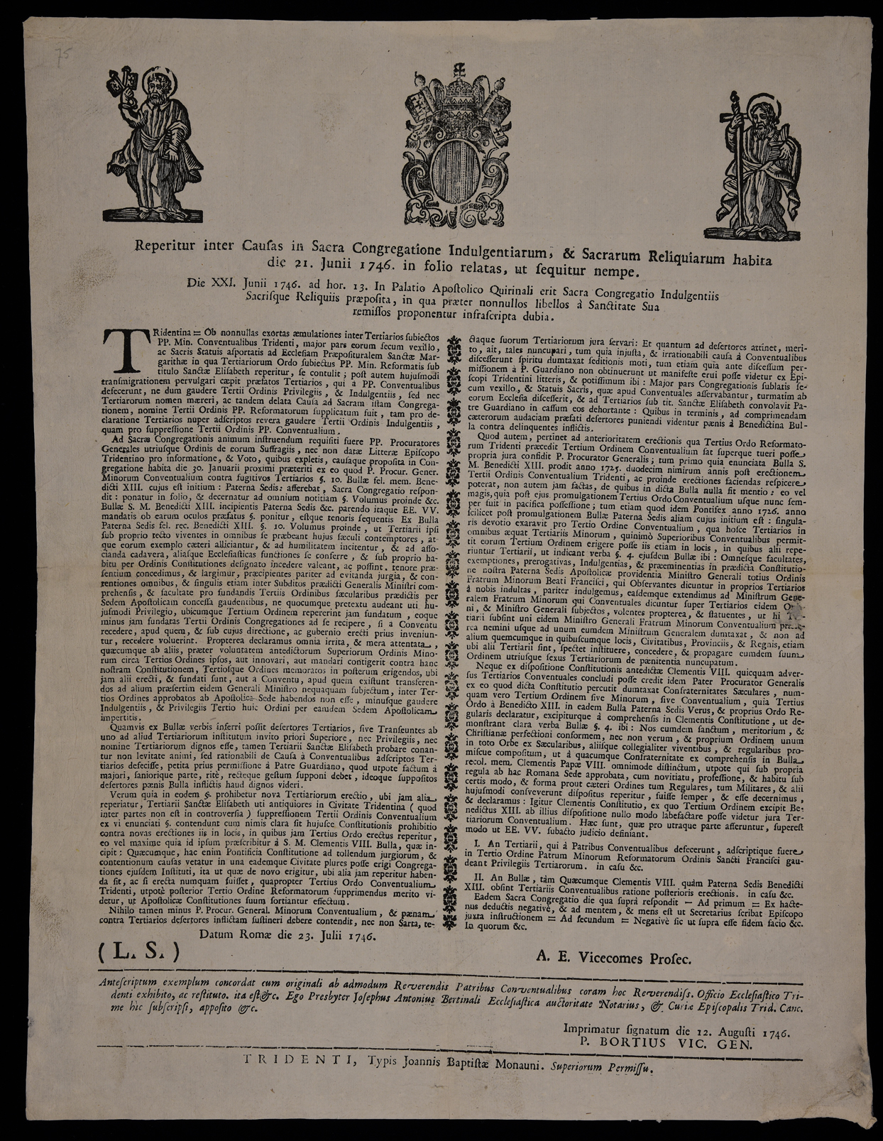 Data di stampa dalla data di emanazione in calce al testo: Trento, 12 agosto 1746, sottoscritto da Pantalone Borzio (vicario generale)
