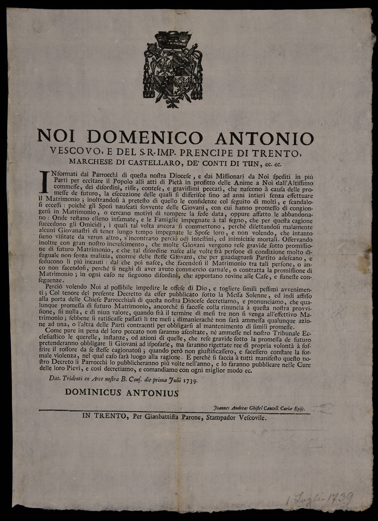 Proclama sul matrimonio emanato l'1 luglio 1739 da Domenico Antonio Thun principe-vescovo di Trento, stemma di Domenico Antonio Thun, sottoscritto da Domenico Antonio e Giovanni Andrea Ghistel.