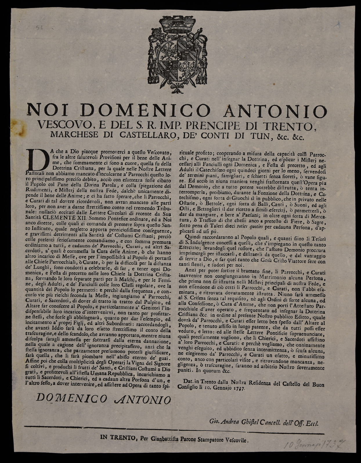 Proclama sulla dottrina cristiana emanato il 10 gennaio 1737 da Domenico Antonio Thun principe-vescovo di Trento, stemma di Domenico Antonio Thun.