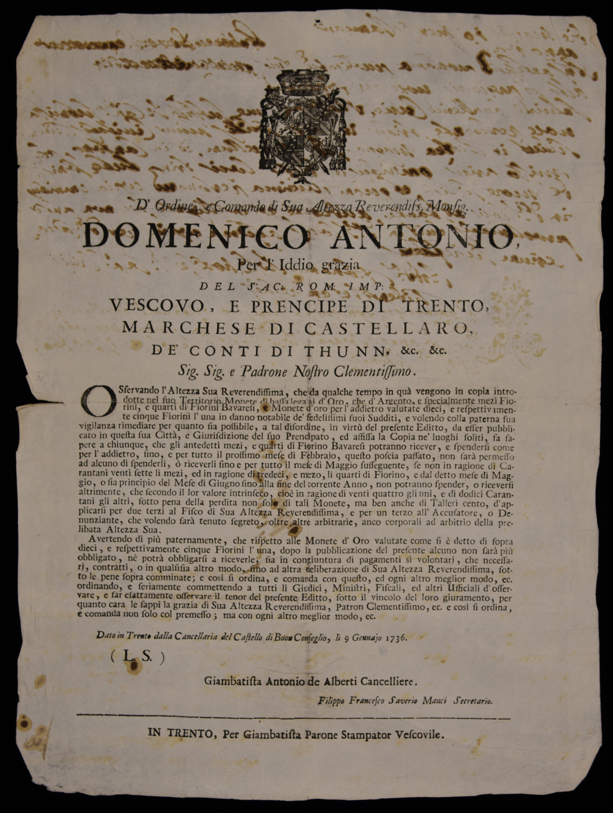 Proclama di Domenico Antonio Thun, principe-vescovo di Trento, che proibisce la circolazione nel principato di Trento di monete d'oro e d'argento di bassa lega, emanato il 9 gennaio 1736, sottoscritto da Giambattista Antonio Alberti e Filippo Francesco Saverio Manci.