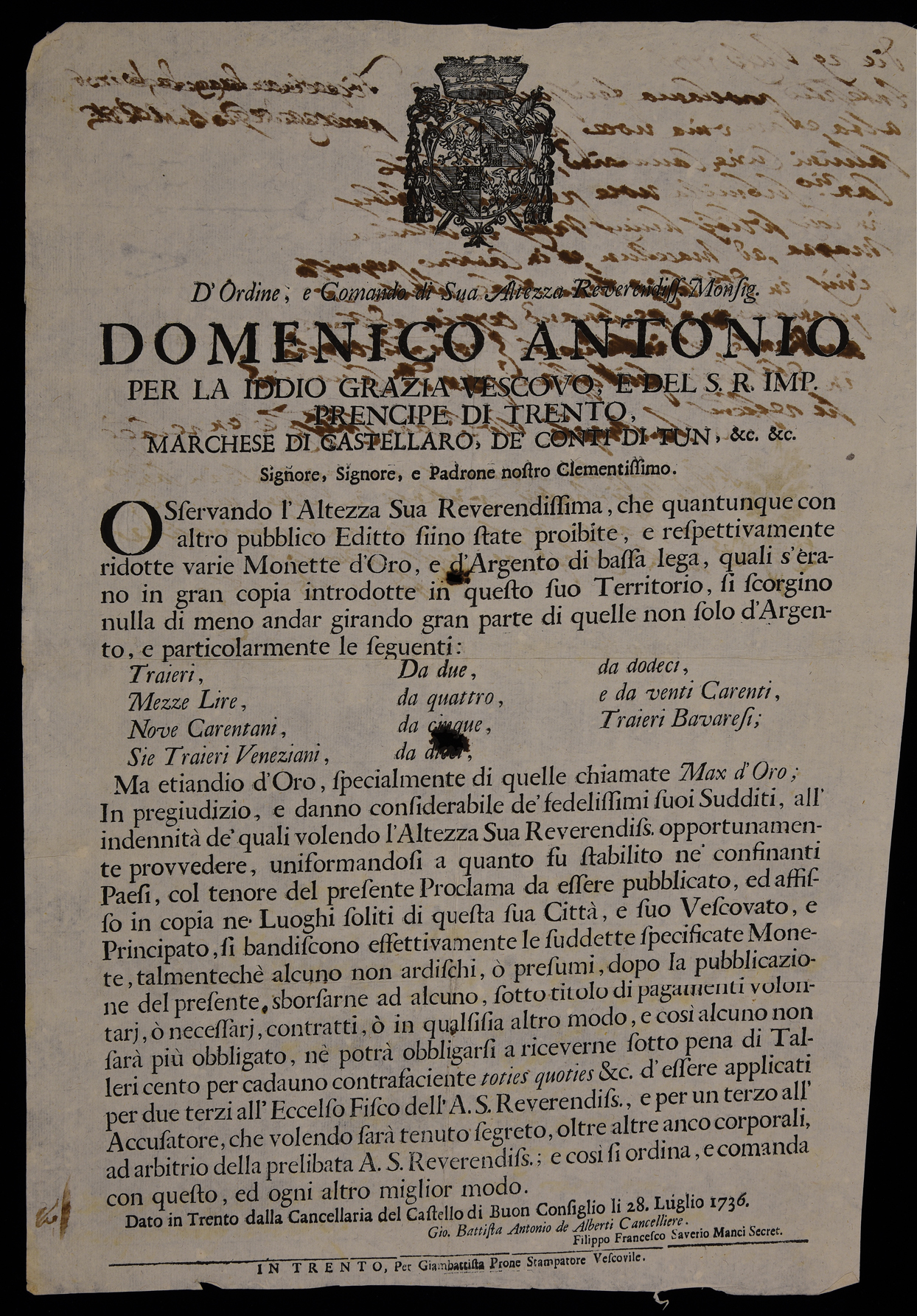 Proclama che proibisce la circolazione nel principato di Trento di monete d'oro e d'argento di bassa lega emanato il 28 luglio 1736 da Domenico Antonio Thun, principe-vescovo di Trento, stemma di Domenico Antonio Thun.
