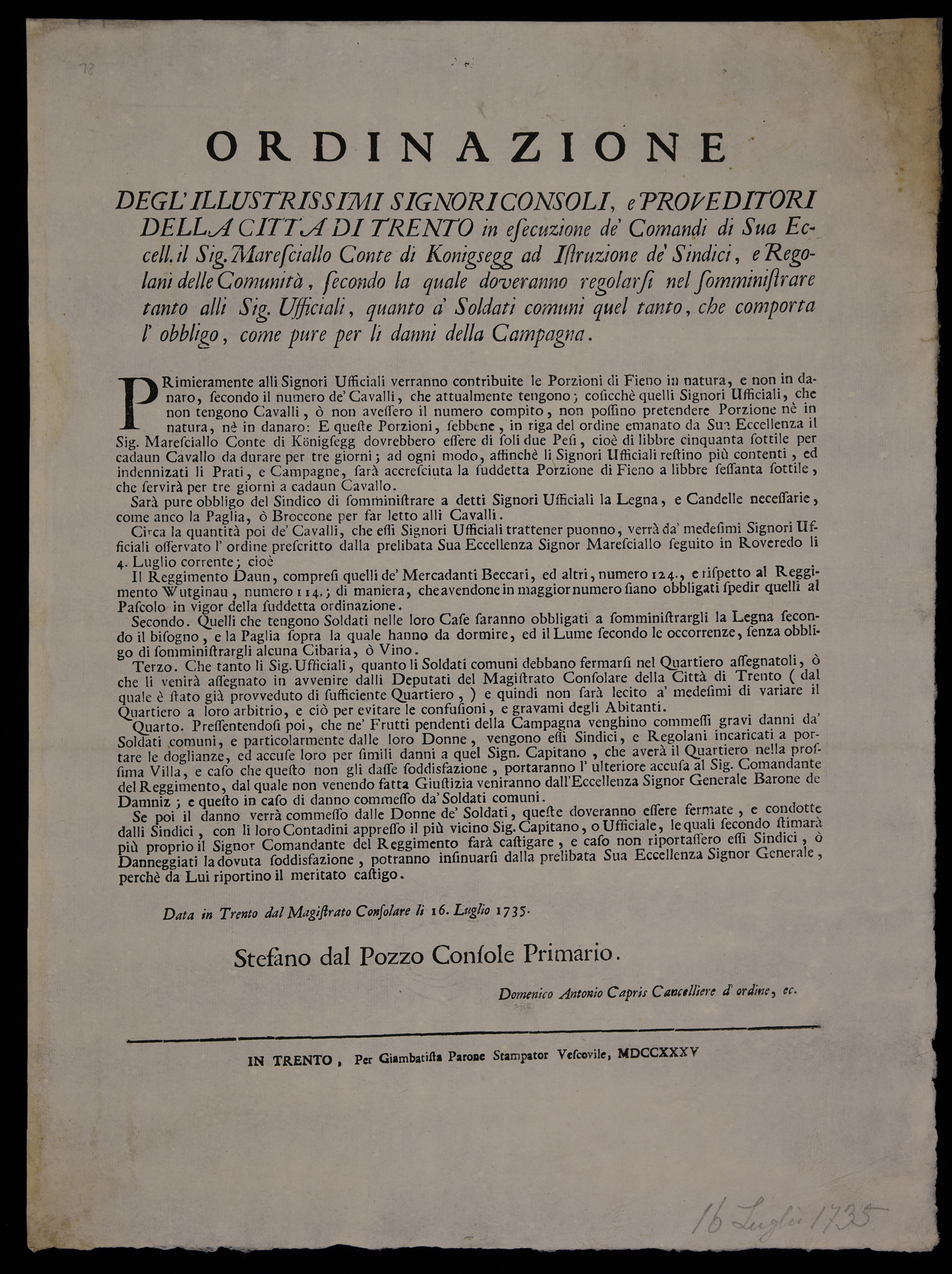 Proclama sugli obblighi della popolazione nei confronti dell'esercito imperiale emanato il 16 luglio 1735 dal Magistrato consolare di Trento.