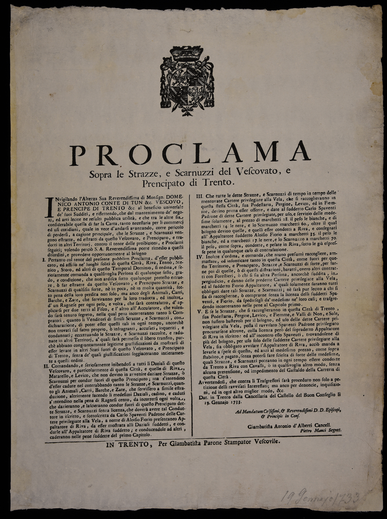 Proclama sulle cartiere emanato il 19 gennaio 1733 da Domenico Antonio Thun, principe-vescovo di Trento, stemma di Domenico Antonio Thun