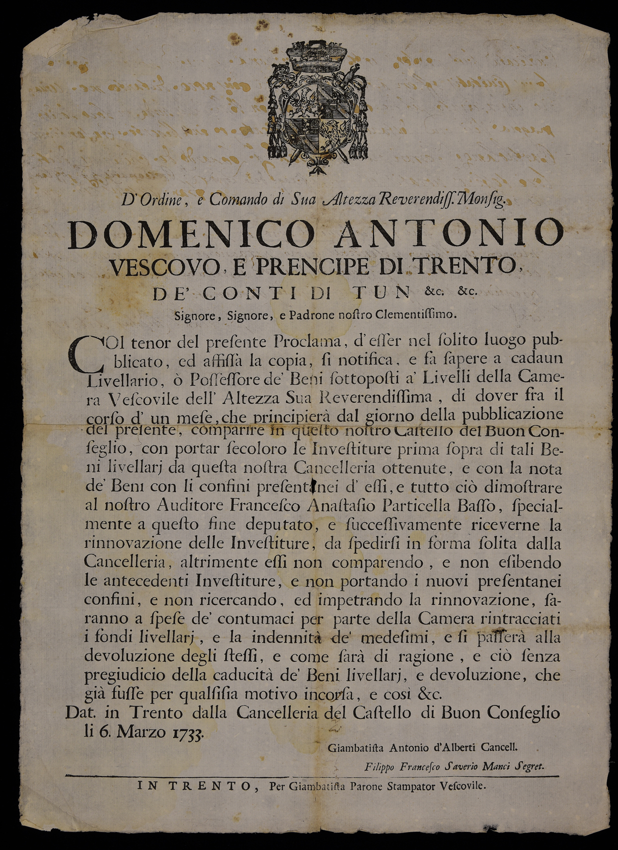 Proclama sui livelli emanato il 6 marzo 1733 da Domenico Antonio Thun, principe-vescovo di Trento, stemma di Domenico Antonio Thun, sottoscritto da Giambattista Antonio Alberti e Filippo Francesco Saverio Manci.