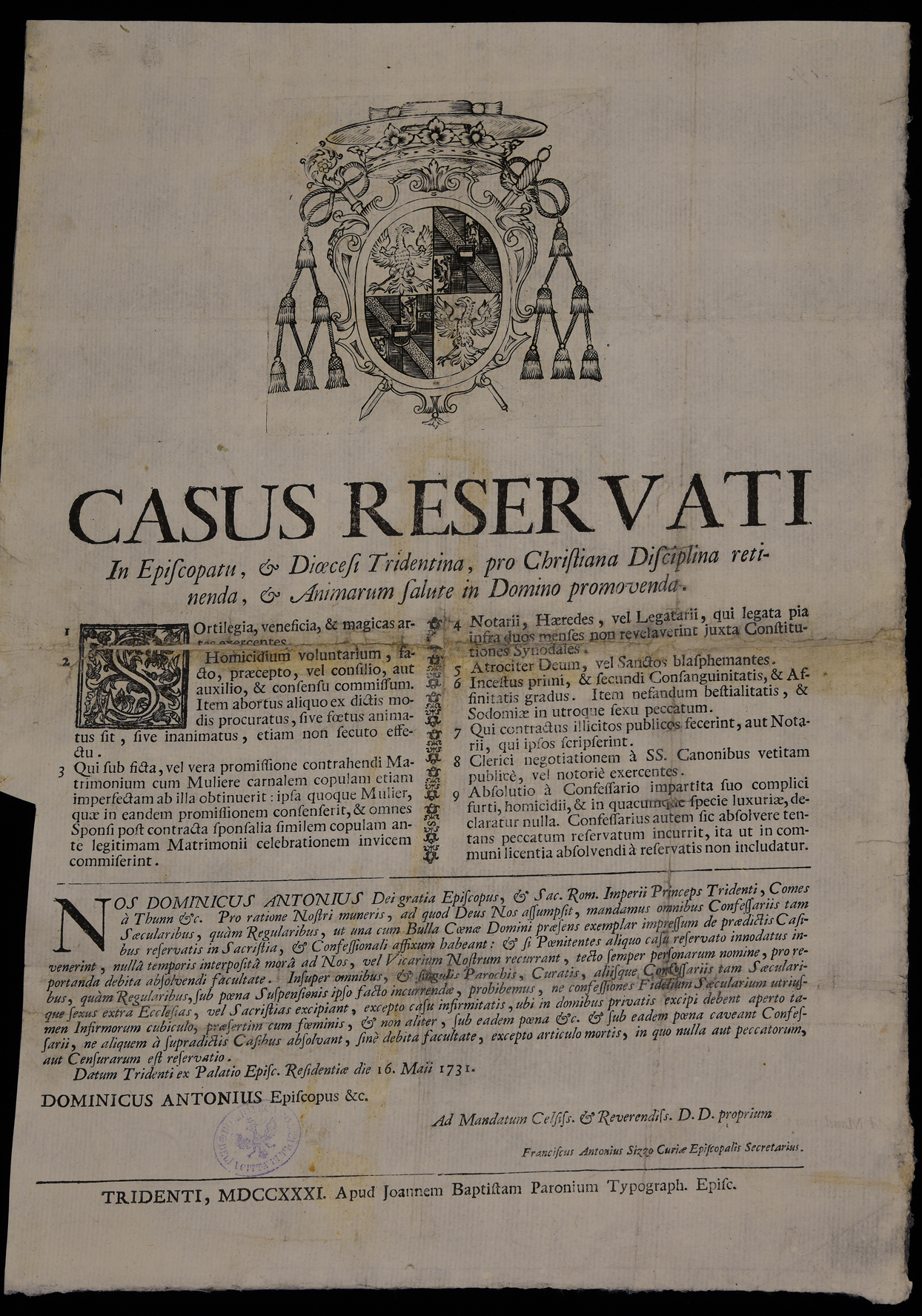 Proclama sulla confessione emanato il 16 maggio 1731 da Domenico Antonio Thun, principe-vescovo di Trento, stemma di Domenico Antonio Thun