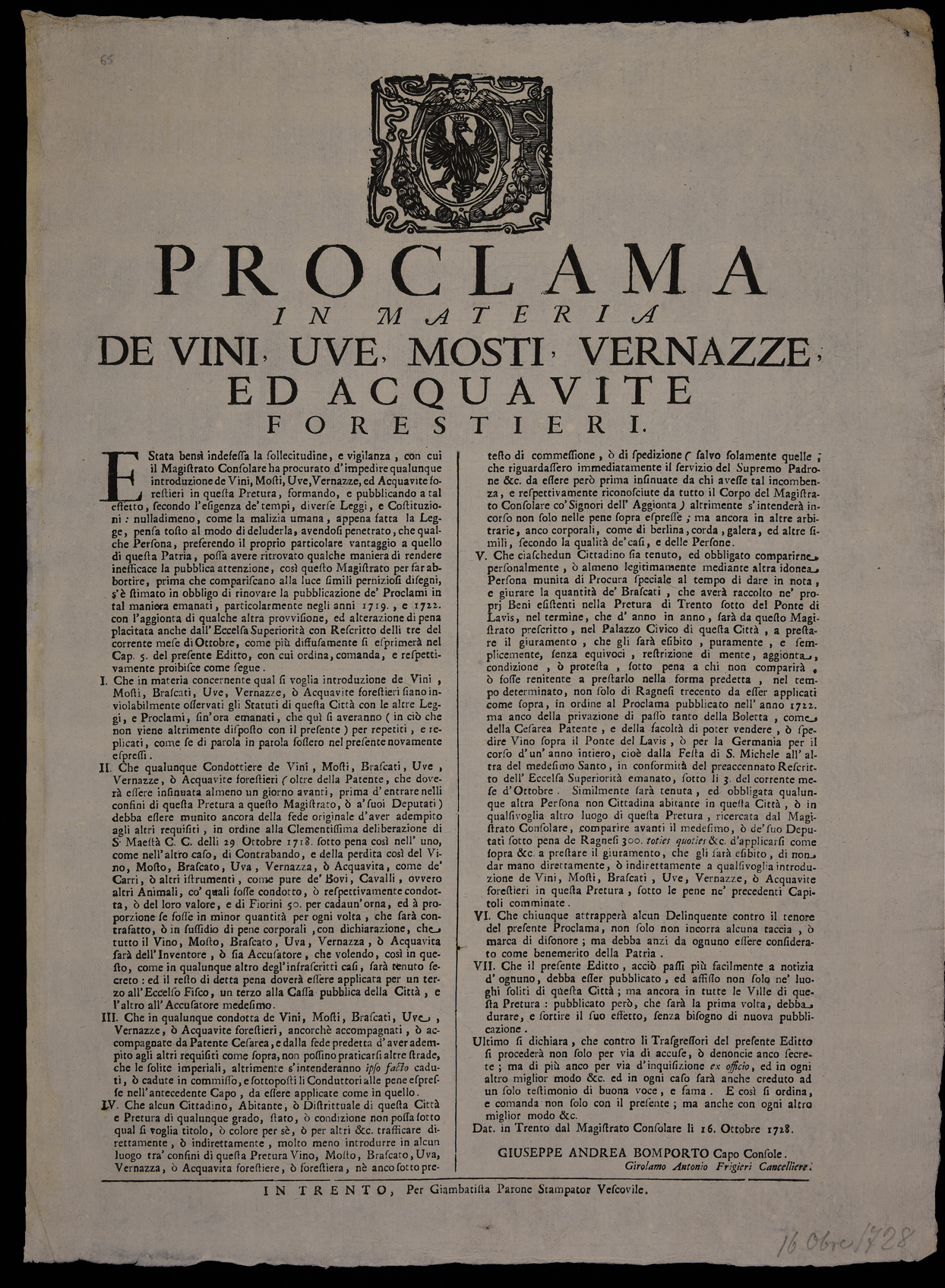 Proclama su vini e grappe emanato il 16 ottobre 1728 dal Magistrato consolare di Trento, stemma del Magistrato consolare di Trento, sottoscritto da Giuseppe Andrea Bomporto e Girolamo Antonio Frigeri.