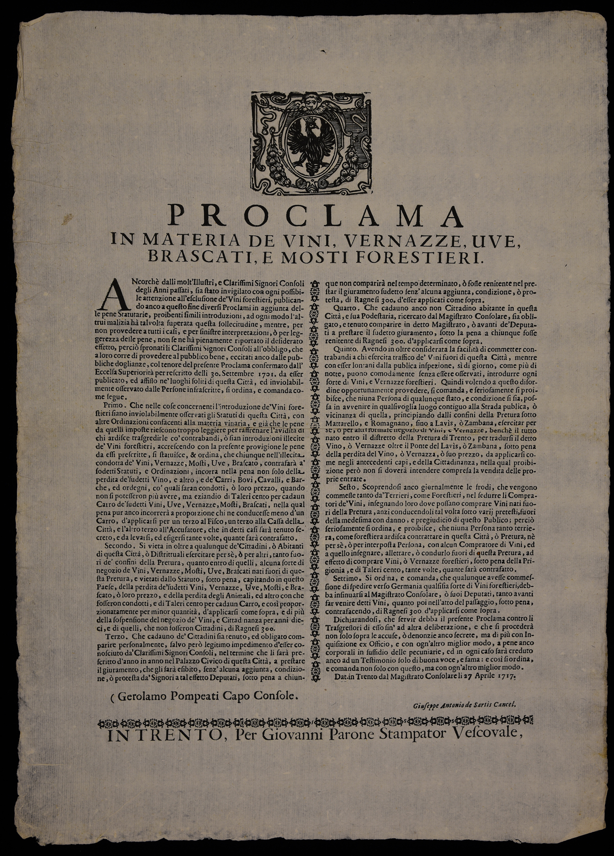 Proclama in materia de vini, vernazze, uve, brascati, e mosti forestieri