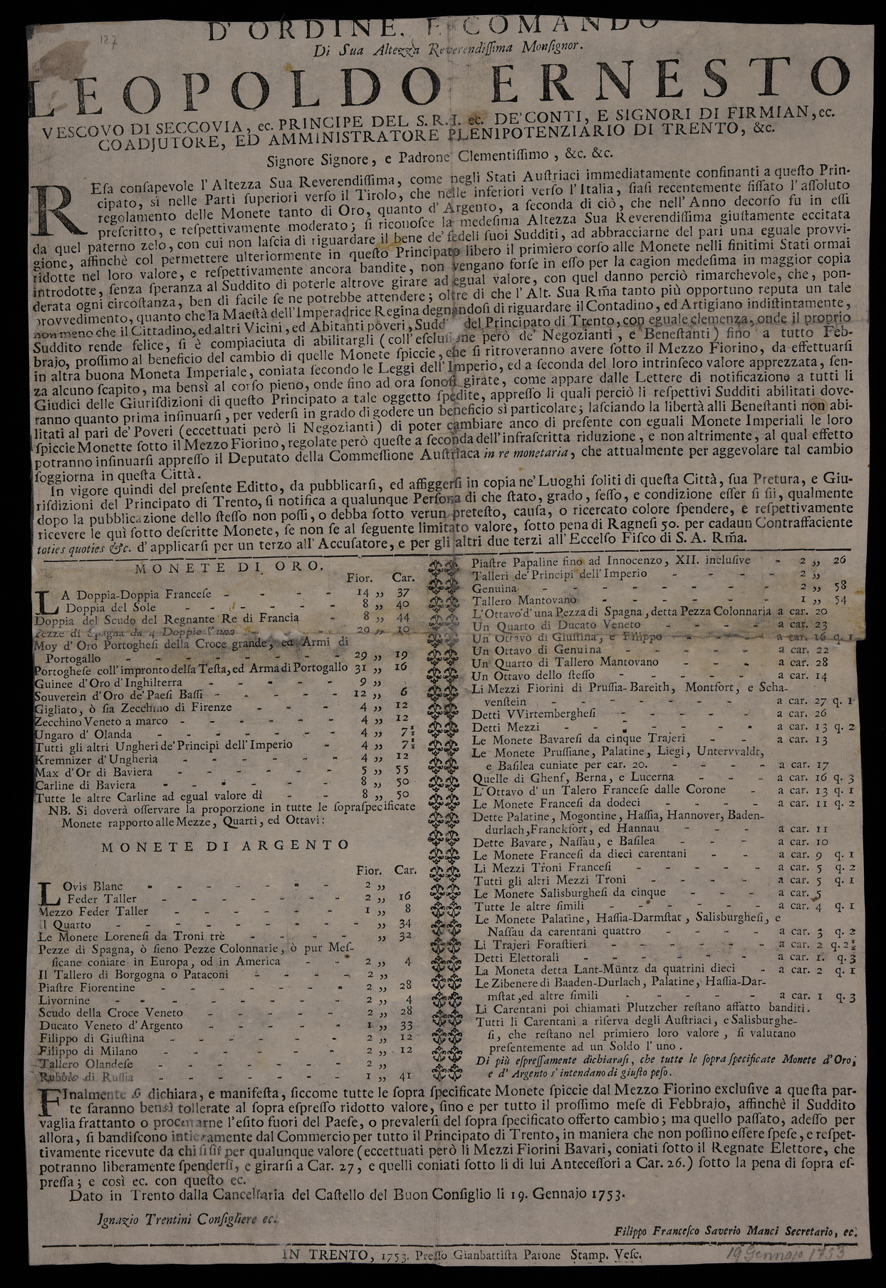 Proclama di Leopoldo Ernesto Firmian sul valore delle monete, emanato il 19 gennaio 1753, sottoscritto da Ignazio Trentini (consigliere) e Filippo Francesco Saverio Manci (segretario).